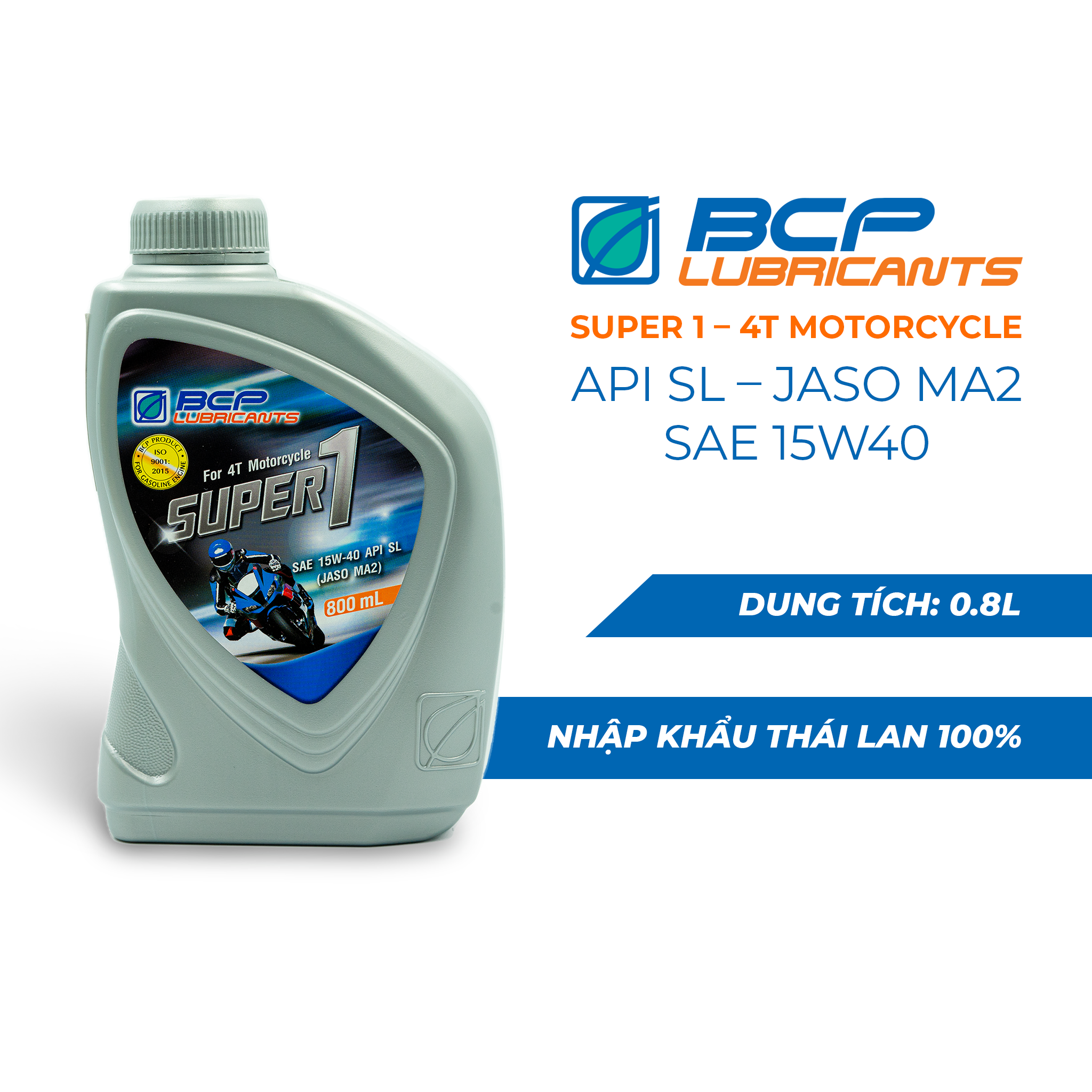 • Không chồng chất quá 6 Thùng lên nhau nhằm tránh biến dạng những chai ở lớp dưới cùng   Nhớt xe số BCP Super 1 - SAE 15W40 - API SL - JASO MA2 - 800 mL BCP Super 1 4T Motorcycle là sản phẩm dầu nhớt đa cấp tổng hợp chuyên dùng cho tất cả các dòng xe số động cơ 4 thì. Nhớt xe số BCP Super 1 phiên bản chai phổ thông 800 ml tiện dụng được sản xuất từ dầu gốc cao cấp và phụ gia đặc biệt, đáp ứng tiêu chuẩn chất lượng quốc tế API SL và JASO MA2 theo yêu cầu riêng dành cho xe số của Hiệp hội Dầu nhớt Hoa Kì và Cơ quan Tiêu chuẩn phương tiện cơ giới Nhật Bản. LỢI ÍCH SẢN PHẨM: