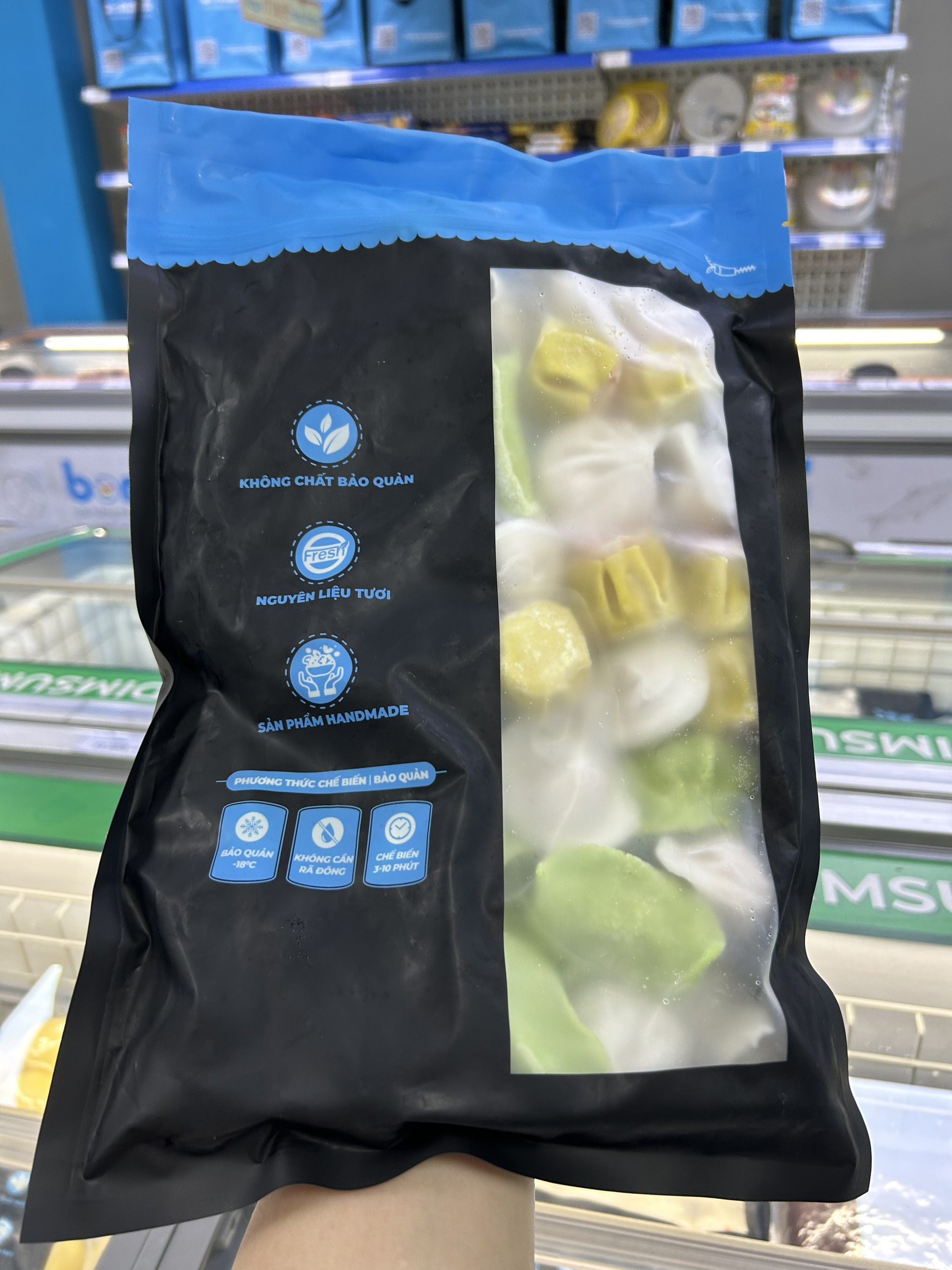 Với sản phẩm tươi sống, trọng lượng thực tế có thể chênh lệch khoảng 10%. ĐỊNH LƯỢNG: 840g/gói THÀNH PHẦN: - Há cảo tôm: (Tôm (45.43 %), mỡ heo, dầu mè, gia vị (muối, tiêu, đường), vỏ bột há cảo) - Há cảo sò điệp: Sò điệp (21 %), tôm (8.5 %), sắn, mảng, hành lá, cà rốt, gia vị (muối, đường, tiêu sọ, dầu hào), vỏ bột mì - Xíu mại tôm: Cá (28.58 %), tôm (17.5 %), dầu nành, dầu mè, gia vị (muối, tiêu, đường), củ năng, măng, cà rốt, bột năng, vỏ bột xíu mại - Há cảo tôm hẹ: Hẹ (18.41%), tôm (18 %), mỡ thắng, hành lá, gia vị (muối, tiêu, đường), vỏ bột há cảo CÁCH CHẾ BIẾN: Không cần rã đông. Hấp ở nhiệt độ 100°C trong thời gian 7-8 phút hoặc bỏ lẩu BẢO QUẢN: Bảo quản nhiệt độ -18°C HSD: 18 tháng