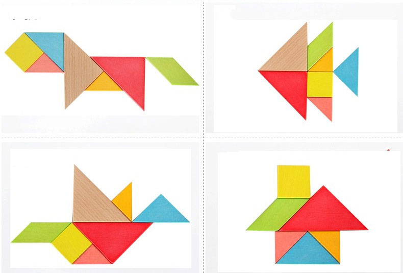 Đồ Chơi Gỗ Xếp Hình Trí Uẩn 7 Mảnh có 7 miếng gỗ lắp ráp được thành rất nhiều các hình khác nhau dựa trên sức sáng tạo của trẻ, hoặc lắp ráp thành hơn 500 hình sinh động.
