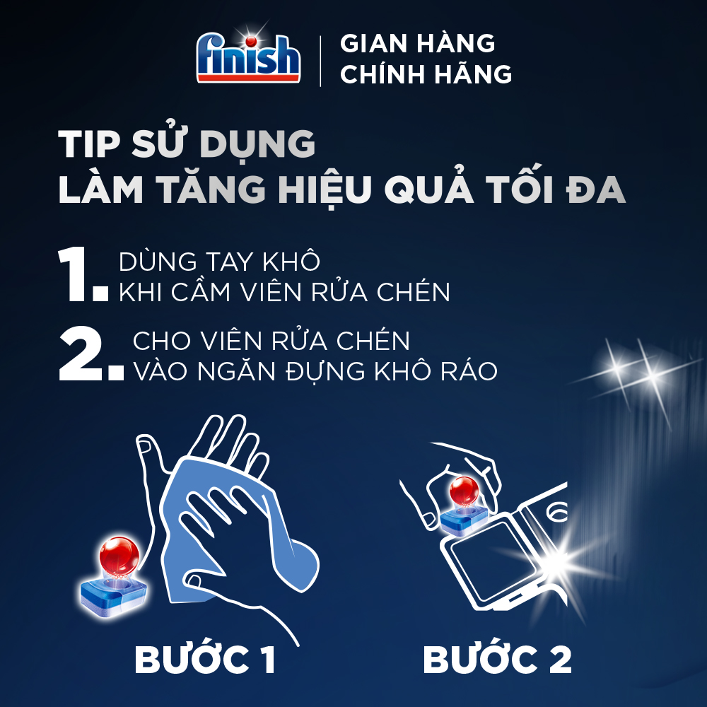 MÔ TẢ SẢN PHẨM: Viên rửa chén Finish dành cho máy rửa chén tự động 10x Sức mạnh làm sạch Bao gồm Chất tẩy rửa và với gấp 5 lần so với dòng Classic Finish