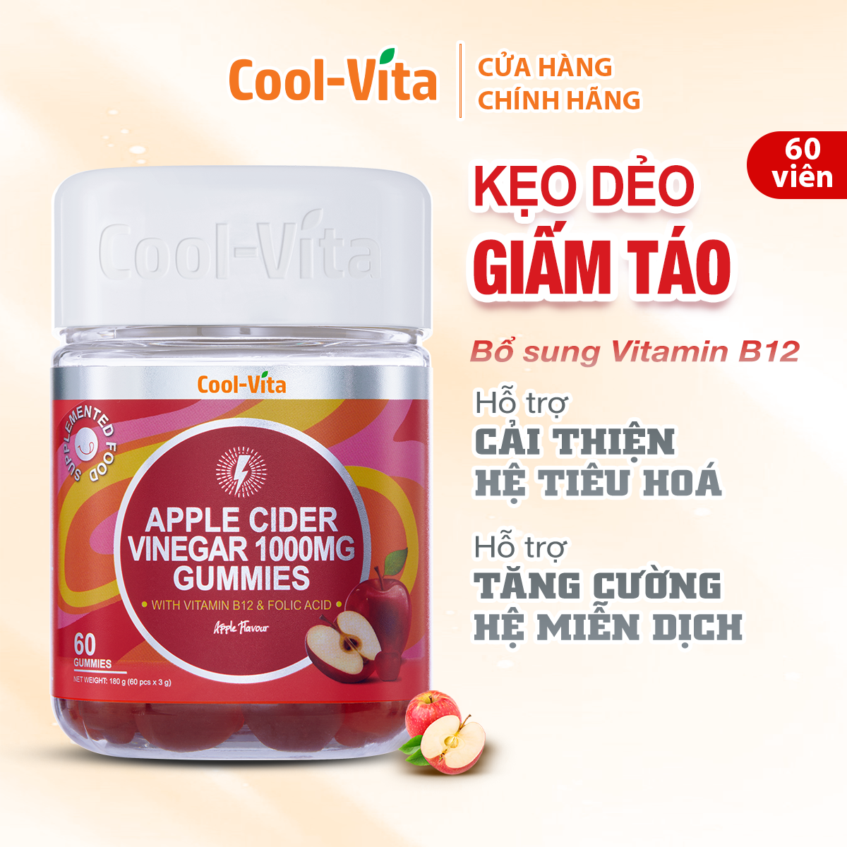Kẹo Dẻo Giấm Táo Vitamin B12 Hỗ Trợ Tiêu Hóa, Tăng Cường Miễn Dịch Coolvita (60 viên x 3g)/hộp   Kẹo dẻo giấm táo giúp bổ sung thêm Vitamin B12 & Axit Folic là một