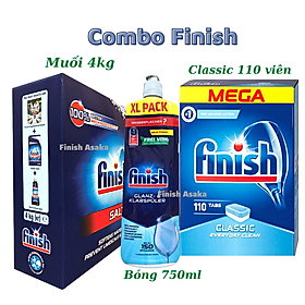 ✨Combo rửa chén Finish: Classic hộp 110 viên, Nước làm bóng 750ml, Muối hộp 4kg - Nhập khẩu Châu Âu.