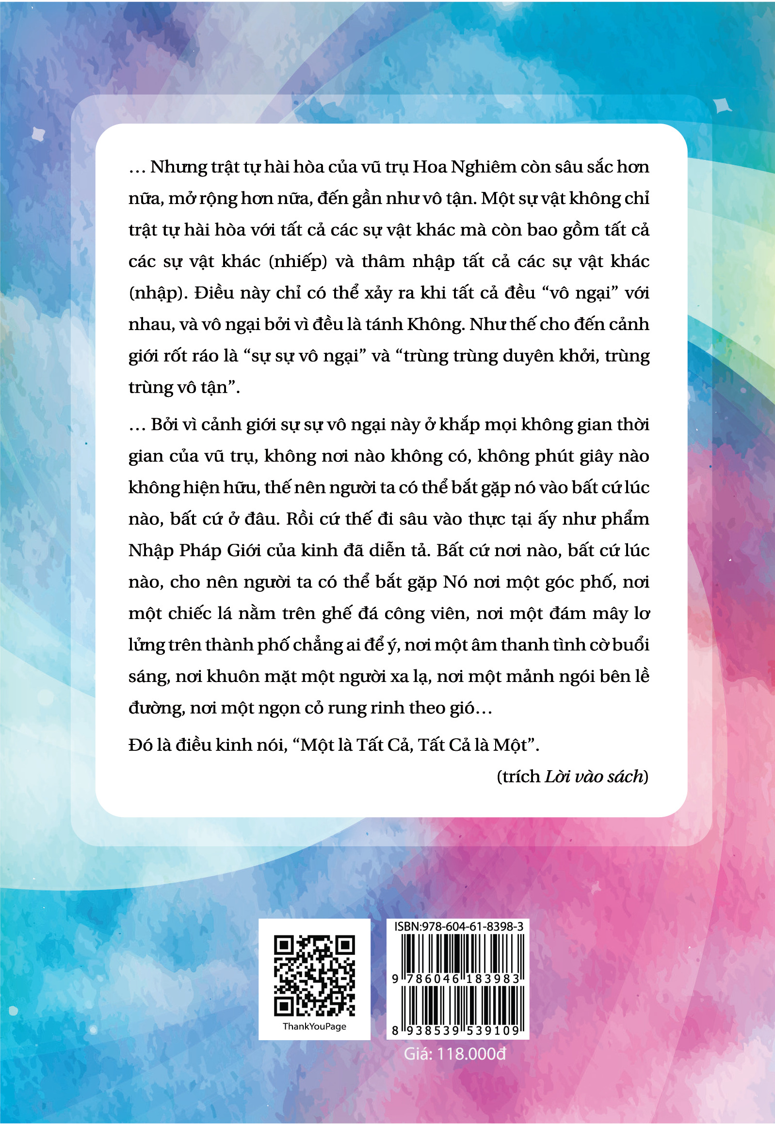 Từ “Vũ trụ” hay “Kosmos” trong tiếng Hy Lạp có nghĩa là trật tự, hài hòa. Hy Lạp là cái nôi của nền văn minh Tây phương cho đến hiện đại. Vũ trụ về mặt vĩ mô là các hành tinh, các ngôi sao, cho đến các thiên hà, về mặt vi mô là thế giới của các nguyên tử và các hạt hạ nguyên tử. Tất cả chúng đều hiện hữu trật tự và hài hòa với nhau. Với Đông phương cũng có những quan niệm xưa cổ về vũ trụ, trong văn hóa Ấn Độ và Trung Hoa. Nhưng nói về vũ trụ rộng nhất và sâu nhất là Kinh Hoa Nghiêm, được xem là kinh cao nhất của Phật giáo, được nói ngay sau khi Đức Phật giác ngộ. Kinh Hoa Nghiêm cũng nói vũ trụ ở mặt vĩ mô: những thế giới hải, những thế giới úp, những thế giới ngửa, những thế giới hình như hoa xoắn tròn, những thế giới hình hoa sen…về mặt vi mô, kinh nói “lỗ chân lông, vi trần (hạt bụi nhỏ), sát na (phần nhỏ nhất của một khoảnh khắc)… Và tất cả những cái đó hoàn toàn trật tự, hài hòa với nhau để tạo thành vũ trụ. Nhưng trật tự hài hòa của vũ trụ Hoa Nghiêm còn sâu sắc hơn nữa, mở rộng hơn nữa, đến gần như vô tận. Một sự vật không chỉ trật tự hài hòa với tất cả các sự vật khác mà còn bao gồm tất cả các sự vật khác (nhiếp) và thâm nhập tất cả các sự vật khác (nhập). Điều này chỉ có thể xảy ra khi tất cả đều “vô ngại” với nhau, và vô ngại bởi vì đều là tánh Không. Như thế cho đến cảnh giới rốt ráo là “sự sự vô ngại” và “trùng trùng duyên khởi, trùng trùng vô tận”. Để đạt đến sự thật “sự sự vô ngại”, người ta phải thấy trực tiếp, chứng kiến trực tiếp, qua thí nghiệm trực tiếp, như khoa học. Phòng thí nghiệm, dụng cụ khoa học của chúng ta chính là thân tâm mình. Chính nơi phòng thí nghiệm thân tâm mình mà người ta tìm ra, nhìn thấy sự thực “sự sự vô ngại” của vũ trụ. Thế nên người xưa thường dùng chữ “thân chứng”, đích thân chứng nghiệm. Phật giáo có rất nhiều dụng cụ phương tiện cho việc này, tất cả nằm trong những khả năng sẵn có – chỉ cần mài giũa, làm tinh xảo thêm – của con người. Đó là sức tập trung (Chỉ, Định), khả năng quan sát, tưởng tượng sắc bén (Quán), những hoạt động tương ứng với sự thật (Hạnh), sự tha thiết mong cầu (Nguyện), lòng vị tha muốn ích lợi cho người khác (từ bi)… Bởi vì cảnh giới sự sự vô ngại này ở khắp mọi không gian thời gian của vũ trụ, không nơi nào không có, không phút giây nào không hiện hữu, thế nên người ta có thể bắt gặp nó vào bất cứ lúc nào, bất cứ ở đâu. Rồi cứ thế đi sâu vào thực tại ấy như phẩm Nhập Pháp Giới của kinh diễn tả. Bất cứ nơi nào, bất cứ lúc nào, cho nên người ta có thể bắt gặp Nó nơi một góc phố, nơi một chiếc lá nằm trên ghế đá công viên, nơi một đám mây lơ lửng trên thành phố chẳng ai để ý, nơi một âm thanh tình cờ buổi sáng, nơi khuôn mặt một người xa lạ, nơi một mảnh ngói bên lề đường, nơi một ngọn cỏ rung rinh theo gió… Đó là điều kinh nói, “Một là Tất Cả, Tất Cả là Một”.