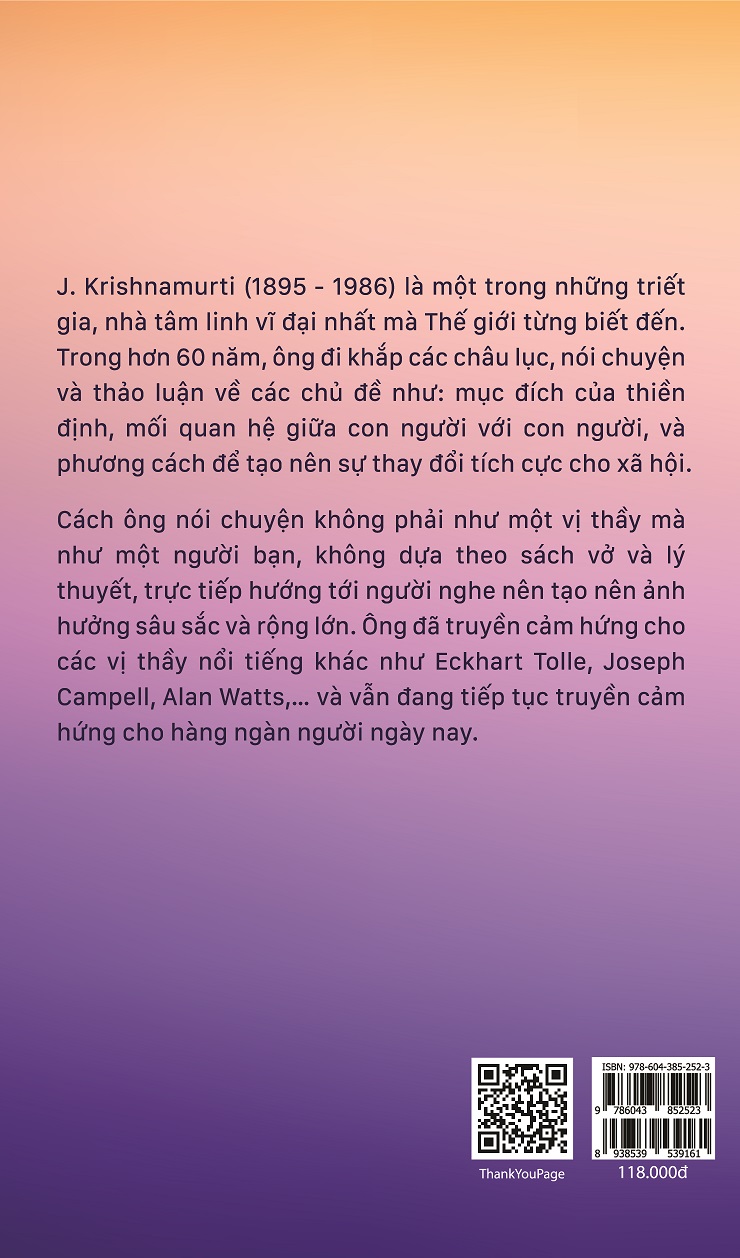 KRISHNAMURTI THỰC TẠI HIỆN TIỀN Thực tại, cái mà con người đã tìm kiếm suốt hàng triệu năm, cái được diễn giải bởi những bộ óc khác nhau, bởi những người khác nhau với những khuynh hướng khác nhau, dưới những nền văn hóa và văn minh khác nhau - là cái không thể hiểu được, không thể đạt tới bởi một tâm trí chỉ bị tra tấn khốn khổ. Điều đó dường như chỉ có thể được chứng nghiệm khi tâm trí hoàn toàn bình thường, hoàn toàn khỏe mạnh, không bị khốn khổ bởi bất kỳ kỷ luật nào, bởi bất kỳ sự cưỡng chế nào, bởi bất kỳ hình thức ép buộc hoặc bất kỳ hình thức bắt chước nào. Một tâm trí như vậy phải đến với nó cùng với sự trẻ trung, với sự tươi mới, không bị mài mòn, không bị trầy xước, ngây thơ, sinh động, khỏe mạnh, hoàn toàn nguyên sơ, có khả năng cảm nhận mãnh liệt, có thể nhìn thấy vẻ đẹp của một cái cây, nụ cười của một em bé và nỗi thống khổ của một người phụ nữ chưa bao giờ được ăn no… nếu không nó sẽ không bao giờ tìm thấy. Thông qua ba phần lớn Trước Mắt Bạn Là Cái Gì - Làm Sao Để Thấy Thực Tại - Thực Tại Hiện Tiền, cuốn sách J. Krisnamurti Thực Tại Hiện Tiền sẽ bàn về những điều sâu sắc và đẹp đẽ đó, những điều tưởng như mờ hồ nhưng luôn hiện hữu quanh ta và ảnh hưởng tới toàn bộ đời sống thân và tâm của chúng ta.
