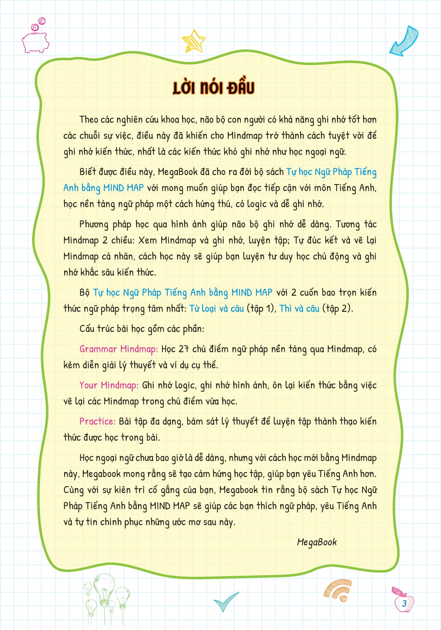 Megabook đã cho ra đời bộ sách Tự học Ngữ Pháp Tiếng Anh bằng MINDMAP mới mong muốn giúp bạn đọc tiếp cận với môn Tiếng Anh, học nền tảng ngữ pháp một cách hứng thú, có logic và dễ ghi nhớ.