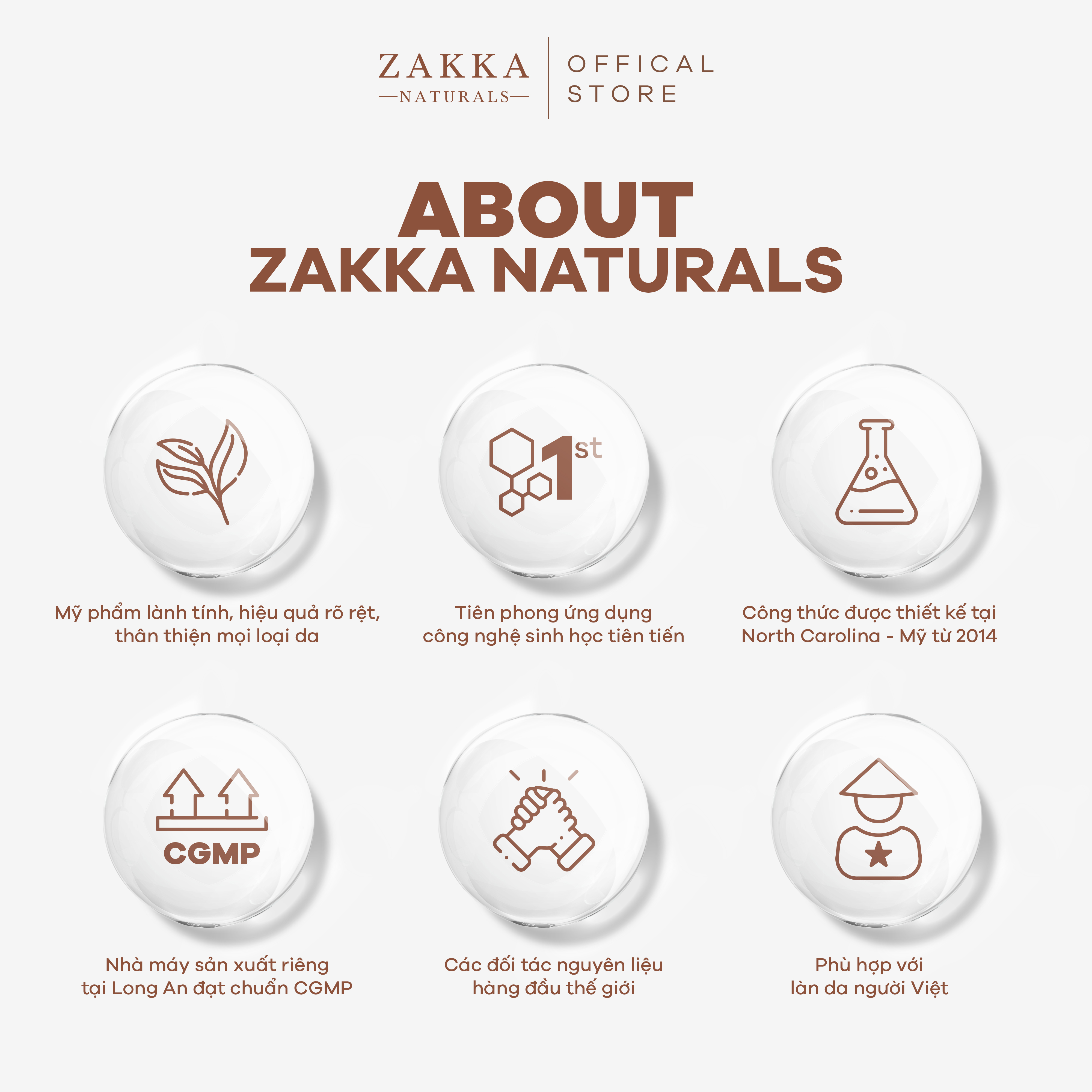 THÔNG TIN THƯƠNG HIỆU: Zakka Naturals là thương hiệu mỹ phẩm thiên nhiên, ứng dụng công nghệ sinh học tiên tiến nhằm đem lại hiệu quả cao cho mọi loại da và đặc biệt phù hợp với môi trường Việt Nam.