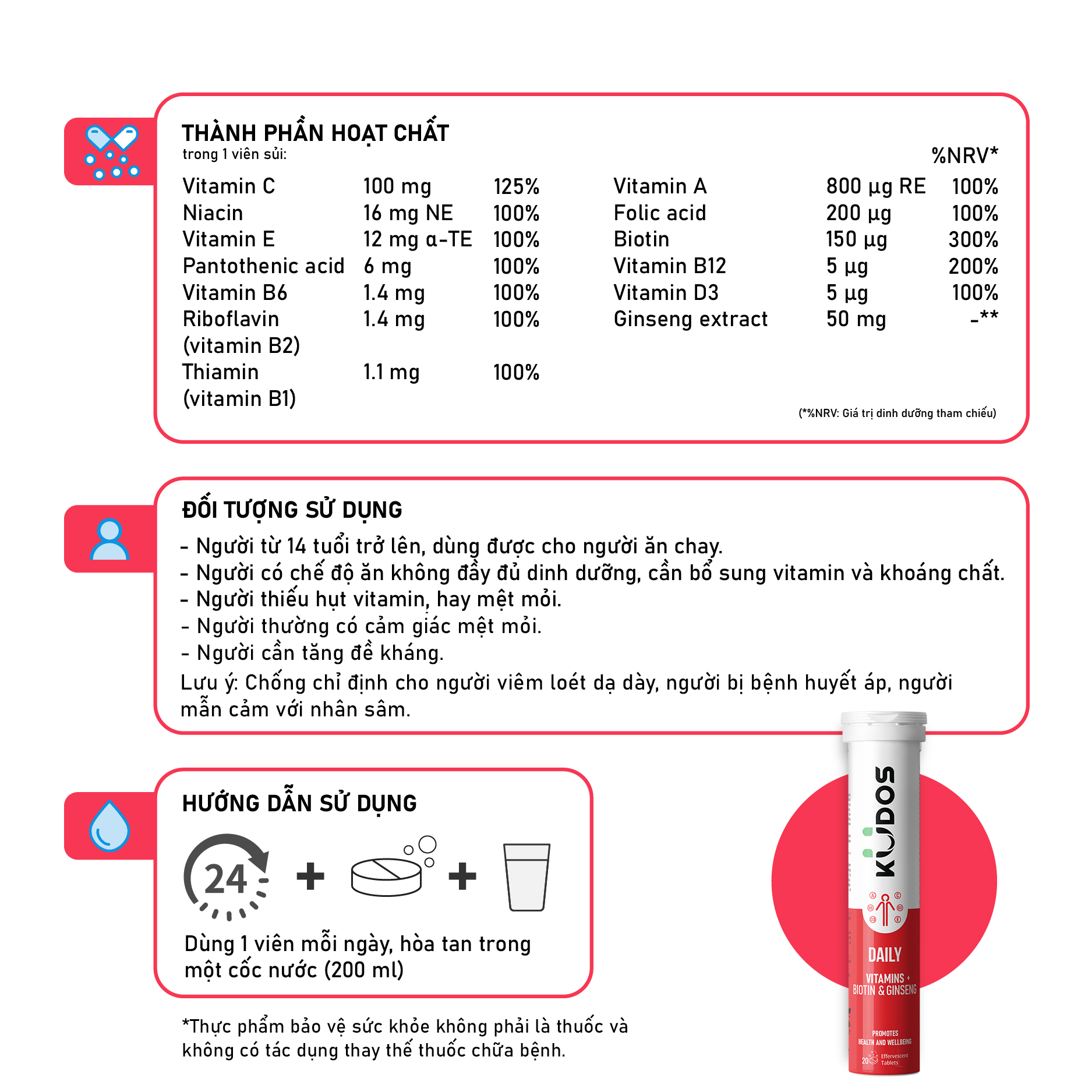 - KUDOS DAILY VITAMINS PLUS BIOTIN & GINSENG Trong mỗi viên sủi 4 g chứa: Vitamin C (Acid L-ascorbic) 100 mg, Chiết xuất nhân sâm 50 mg, Niacin (Nicotinamid) 16 mg NE, Vitamin E (DL-alpha-tocopheryl acetat) 12 mg α-TE, Acid pantothenic (D-pantothenat, calci) 6 mg, Vitamin B2 (Natri riboflavin 5’-phosphat) 1,4 mg, Vitamin B6 (Pyridoxin hydroclorid) 1,4 mg, Vitamin B1 (Thiamin mononitrat) 1,1 mg, Vitamin A (Retinyl acetat) 800 µg RE, Acid folic (Acid pteroymonoglutamic) 200 µg, Biotin (DBiotin) 150 µg, Vitamin D3 (Cholecalciferol) 5 µg, Vitamin B12 (Cyanocobalamin) 5 µg. Phụ liệu: Chất điều chỉnh độ acid: acid citric, natri hydro carbonat; chất độn: sorbitol; hương liệu tổng hợp (hương cam); chất tạo ngọt tổng hợp: aspartam; chất độn: maltodextrin, bột nước ép củ dền; chất tạo ngọt tổng hợp: acesulfam kali. Đối tượng sử dụng: Trẻ em từ 4 tuổi trở lên có nhu cầu bổ sung calci và vitamin Người lớn và trẻ em từ 14 tuổi trở lên có nhu cầu bổ sung vitamin. Hướng dẫn sử dụng: Dùng 1 viên mỗi ngày, hòa tan trong một cốc nước (200 ml) Bảo quản: Bảo quản dưới 25oC ở nơi khô ráo và đậy nắp kín Chú ý: • Thực phẩm này không phải là thuốc, không có tác dụng thay thế thuốc chữa bệnh. • Không dùng cho người mẫn cảm, kiêng kỵ với bất cứ thành phần nào của sản phẩm. • Phụ nữ có thai, đang cho con bú, người bị viêm loét dạ dày, tá tràng, nên tham khảo ý kiến bác sĩ, chuyên gia y tế trước khi dùng. • Không dùng quá liều khuyến nghị hàng ngày. • Không phù hợp cho trẻ em dưới 14 tuổi. Để xa tầm tay trẻ nhỏ. • Không dùng sản phẩm sau ngày hết hạn. • Sản phẩm là thực phẩm bảo vệ sức khỏe chứa vitamin, khoáng chất và chất tạo ngọt. • Thực phẩm bảo vệ sức khỏe không thay thế cho chế độ ăn uống đa dạng cân bằng và lối sống lành mạnh. • Sản phẩm không chứa lactose, gluten và thân thiện với người ăn chay. Thời hạn sử dụng: 36 tháng kể từ ngày sản xuất NSX, HSD: Xem “MFD” và “EXP” ở đáy tuýp. Xuất xứ: Đức