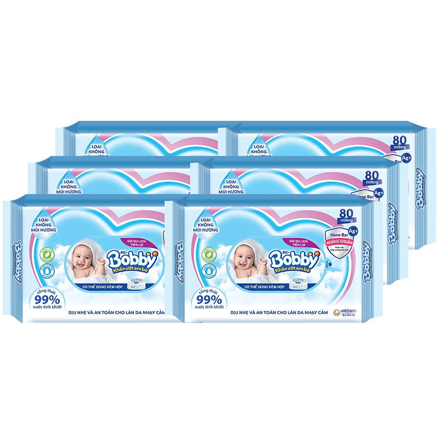 Combo Tiết Kiệm: 6 Gói Khăn Ướt Bobby Care Không Hương 80 Miếng/Gói là sản phẩm chăm sóc sức khỏe giúp Bé yêu và cả gia đình tránh nhiễm khuẩn một cách An toàn và Ưu việt! Nhờ ứng dụng công nghệ Nano Bạc thuần vật lý, đặc biệt loại bỏ nguy cơ kháng kháng sinh - hiện tượng thường gặp khi sử dụng các chất kháng khuẩn khác.