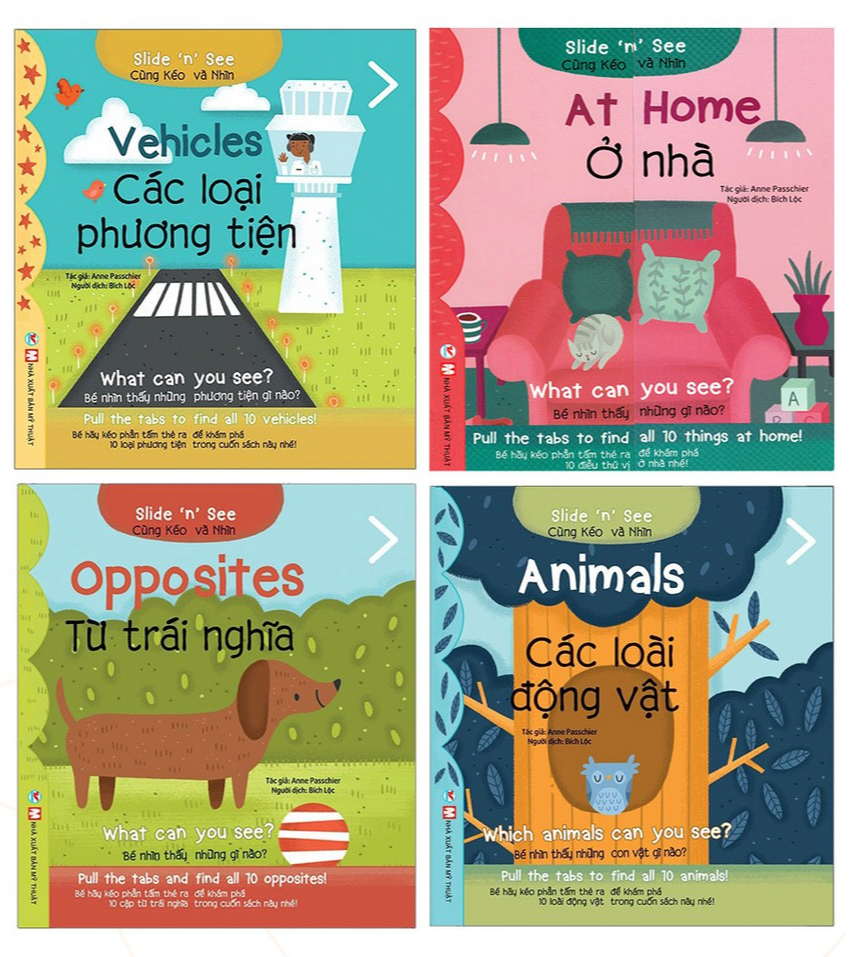 Bộ sách ""Slide and see"" cho bé tương tác trực tiếp kéo phần tấm thẻ ra để khám phá bí mật đằng sau mỗi trang sách. Mỗi cuốn sách được sáng tạo dựa trên một chủ đề và bao gồm các từ vựng Tiếng Anh cho bé vừa chơi vừa học: