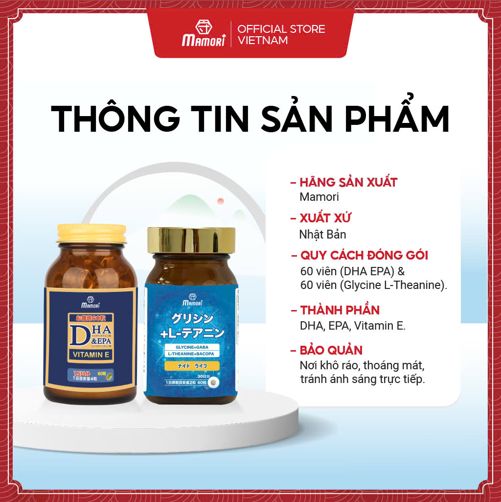 Mua tại TiktokCombo viên uống MAMORI DHA - EPA và Glycine L-theanine là giải pháp hoàn hảo để chăm sóc giấc ngủ và phát triển trí tuệ. Viên uống DHA - EPA từ Nhật Bản hỗ trợ sức khỏe não bộ, cải thiện trí nhớ, và bảo vệ tim mạch, trong khi Glycine, L-theanine giúp giảm căng thẳng, mang đến giấc ngủ sâu hơn. Đây là lựa chọn lý tưởng để nâng cao sức khỏe não bộ và chất lượng giấc ngủ cho bạn và gia đình. 1.1 Thành phần chính trong Viên uống Mamori DHA, EPA, Vitamin E: