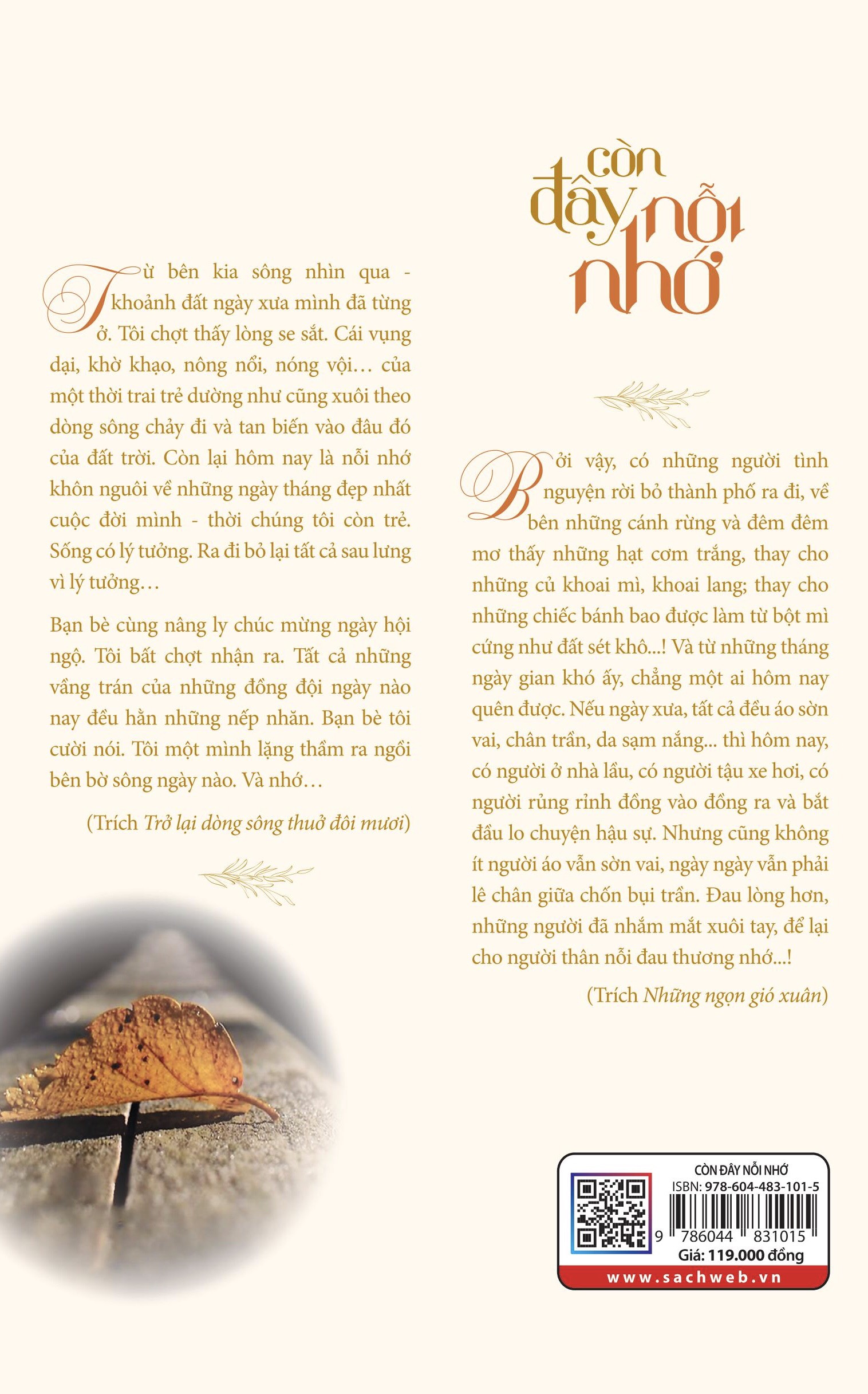 Đây là tập tản văn – bút ký của Bùi Nguyễn Trường Kiên. Trong tập sách “Còn đây nỗi nhớ” phảng phất đâu đó cái giận, cái ghét, hờn ghen và cả cái ác nữa, nhưng chủ yếu vẫn là những điều mà con người luôn hướng đến: Chân, Thiện, Mỹ. Hơn bốn mươi năm, với nghề báo - đi và viết, tác giả đã cóp nhặt những gì đã gặp, đã thấy. Vui có, buồn có, đủ các sắc độ hỷ nộ ái ố… Tác giả tôn trọng sự thật và muốn lưu lại bằng những bài viết lúc với giọng vui, giọng trĩu buồn.