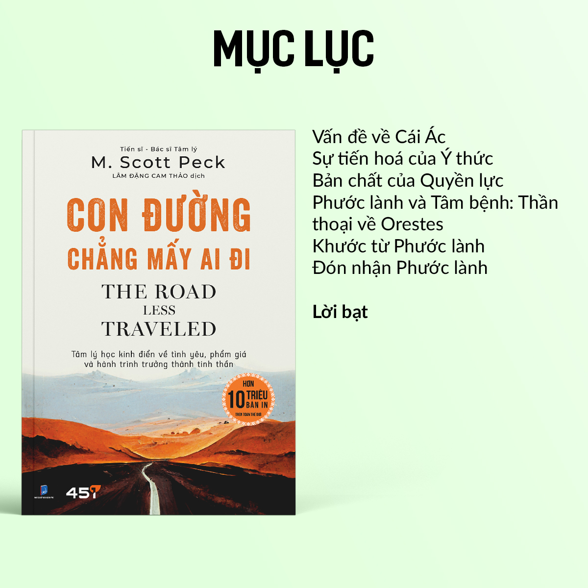 Con Đường Chẳng Mấy Ai Đi là một cuốn sách viết về chủ để Tâm lý, Các tổn thương tâm lý, Tình yêu và Hành trình trưởng thành tinh thần. Cuốn sách cung cấp những công cụ và giải pháp an toàn, thực tiễn và dễ dàng thực hiện, giúp bạn đọc hướng đến một cuộc đời hạnh phúc. Thông qua quá trình trị các bệnh nhân cũng như những trải nghiệm bản thân, tác giả cuốn sách – bác sĩ tâm lý M. Scott Peck, cho chúng ta thấy rằng để có được một cuộc đời hạnh phúc nhất thiết phải đạt được sự trưởng thành về tinh thần. Đây tuy là lối tắt, nhưng lại Con Đường Chẳng Mấy Ai Đi. Cuốn sách này được chia thành bốn phần: Kỷ luật, Tình yêu, Trưởng thành & Tôn giáo và Phước lành.