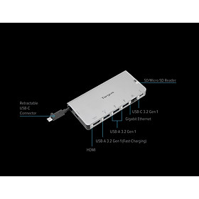 1. Đầu vào: USB Loại C 2. Đầu ra: 1*USB-A 3.0Female, 2*USB-A3.2, 1*USB-C 3.2,2*HDMI, 1*RJ45 Gigabit, 1*TF slot, 1*SD slot, 3.5mm, PD 3. HDMI 1 (màn hình ngoài đơn): Lên đến 4K@60Hz 4. HDMI 2