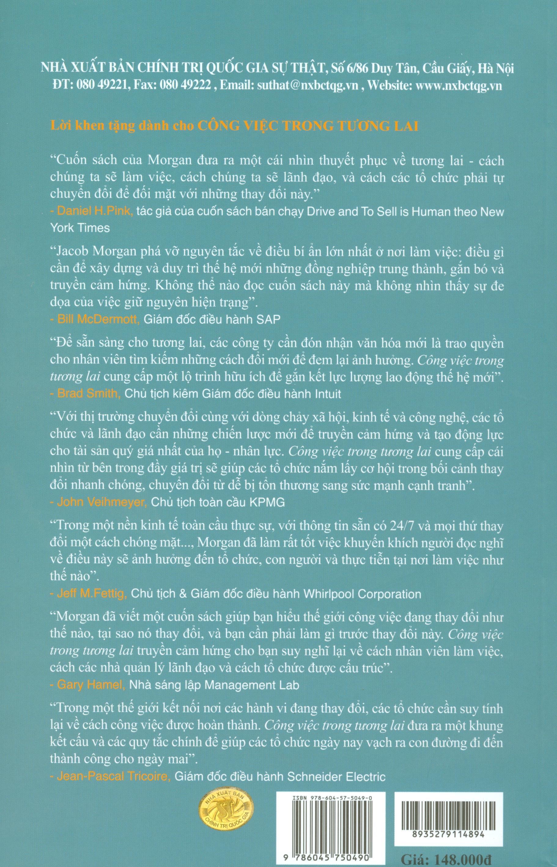 Lời khen dành tặng cuốn sách “Công việc trong tương lai” “Không có sự che giấu trong cuốn sách Công việc trong tương lai. Jacob chỉ ra chính xác cách các tổ chức phải thích nghi để tiến về phía trước, đồng thời truyền cảm hứng cho nhân viên và ác nhà quản lý để làm hết sức mình”.