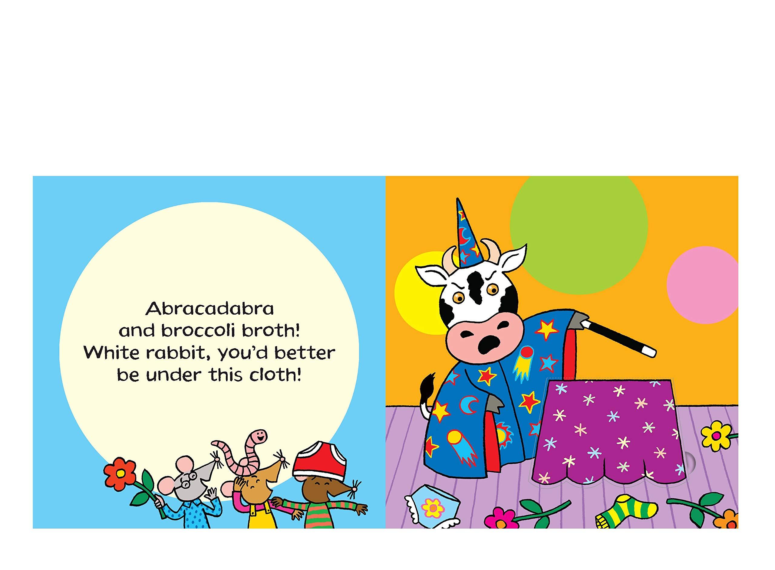 It's Conjuror Cow's big night and she is feeling nervous – will she be able to pull a white rabbit out of her hat? Lift the flaps to see what she makes appear instead. A bunch of flowers? A pig? And lots of pants?! Find out if she manages to wave her wand and save the magic show.