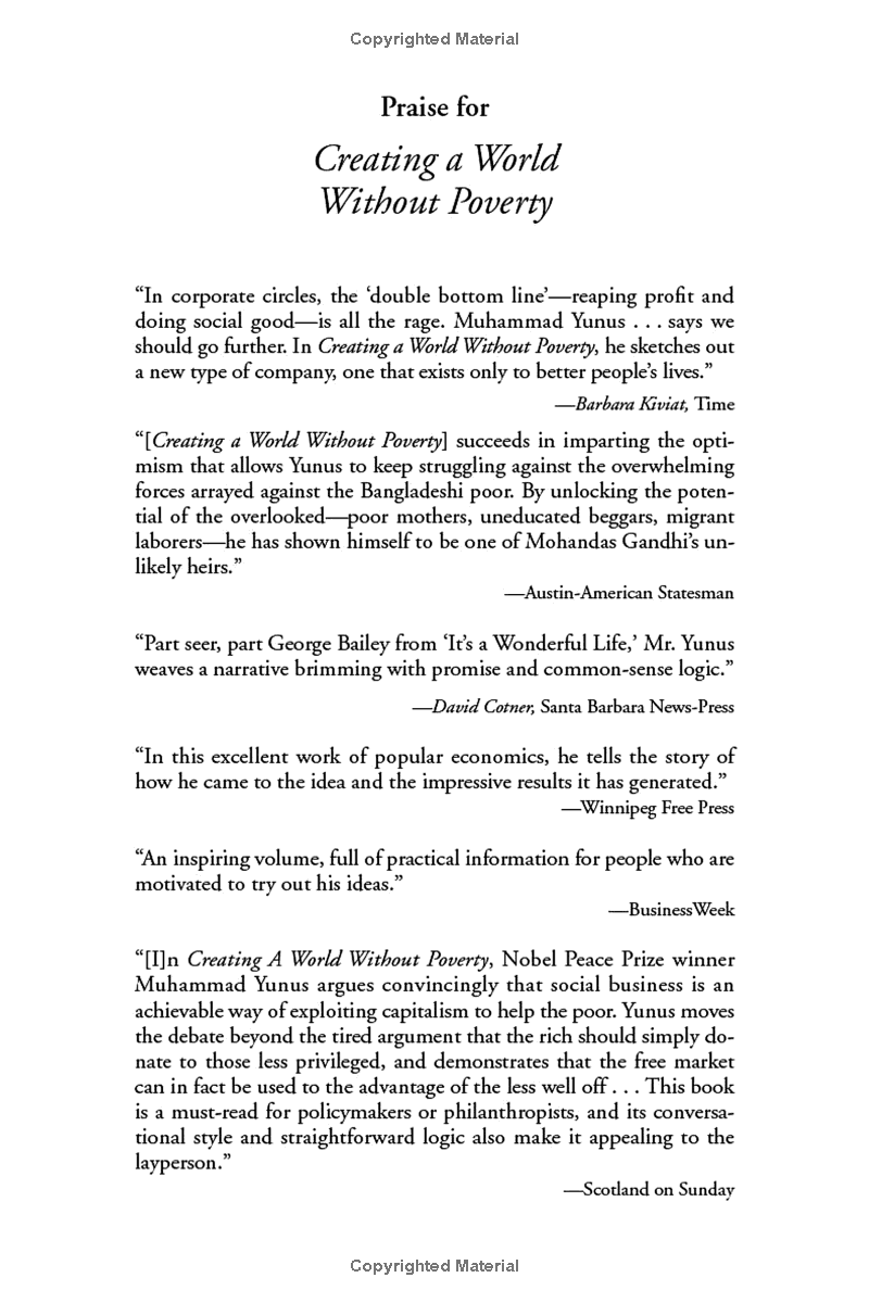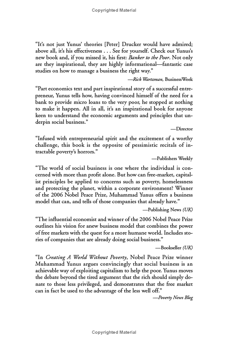 In the last two decades, free markets have swept the globe. But traditional capitalism has been unable to solve problems like inequality and poverty. In Muhammad Yunus' groundbreaking sequel to Banker to the Poor, he outlines the concept of social business -- business where the creative vision of the entrepreneur is applied to today's most serious problems: feeding the poor, housing the homeless, healing the sick, and protecting the planet. Creating a World Without Poverty reveals the next phase in a hopeful economic and social revolution that is already underway.