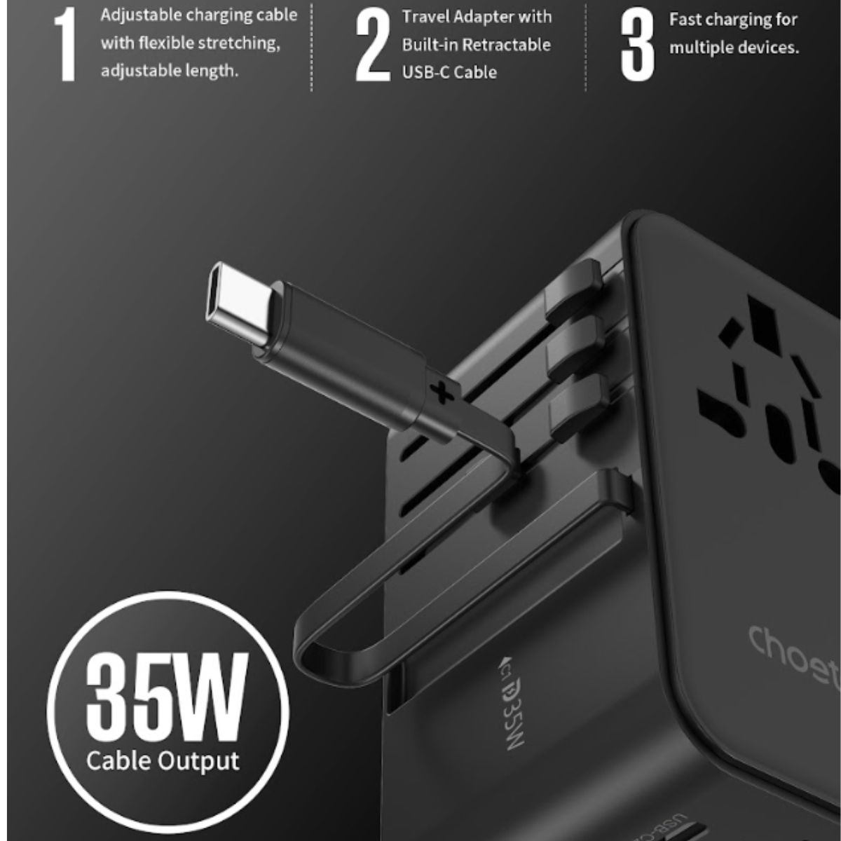 Củ sạc Choetech PD5020 du lịch đa năng tích hợp thêm dây cáp sạc Type C (35W)/ PD5021 (45W)/ PD5022 (70W)- Hàng chính hãng