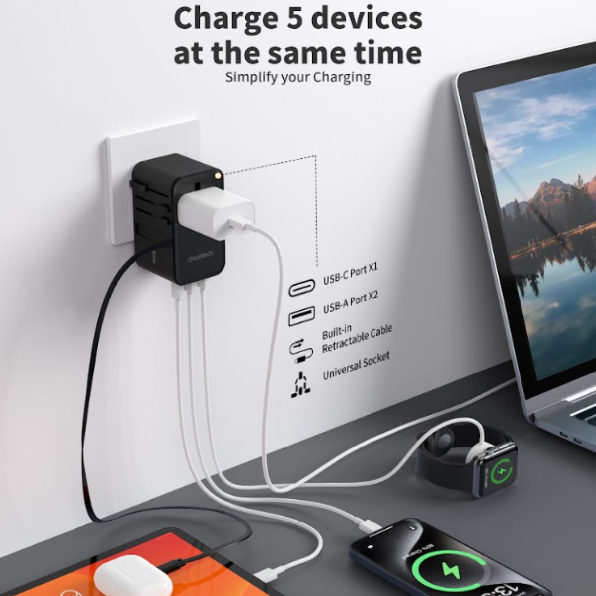 Giới thiệu Củ sạc Choetech PD5020 du lịch đa năng tích hợp thêm dây cáp sạc Type C (35W)/ PD5021 (45W)/ PD5022 (70W)- Hàng chính hãng - Thương hiệu: Choetech - Tính năng: Tích hợp 4 chuẩn