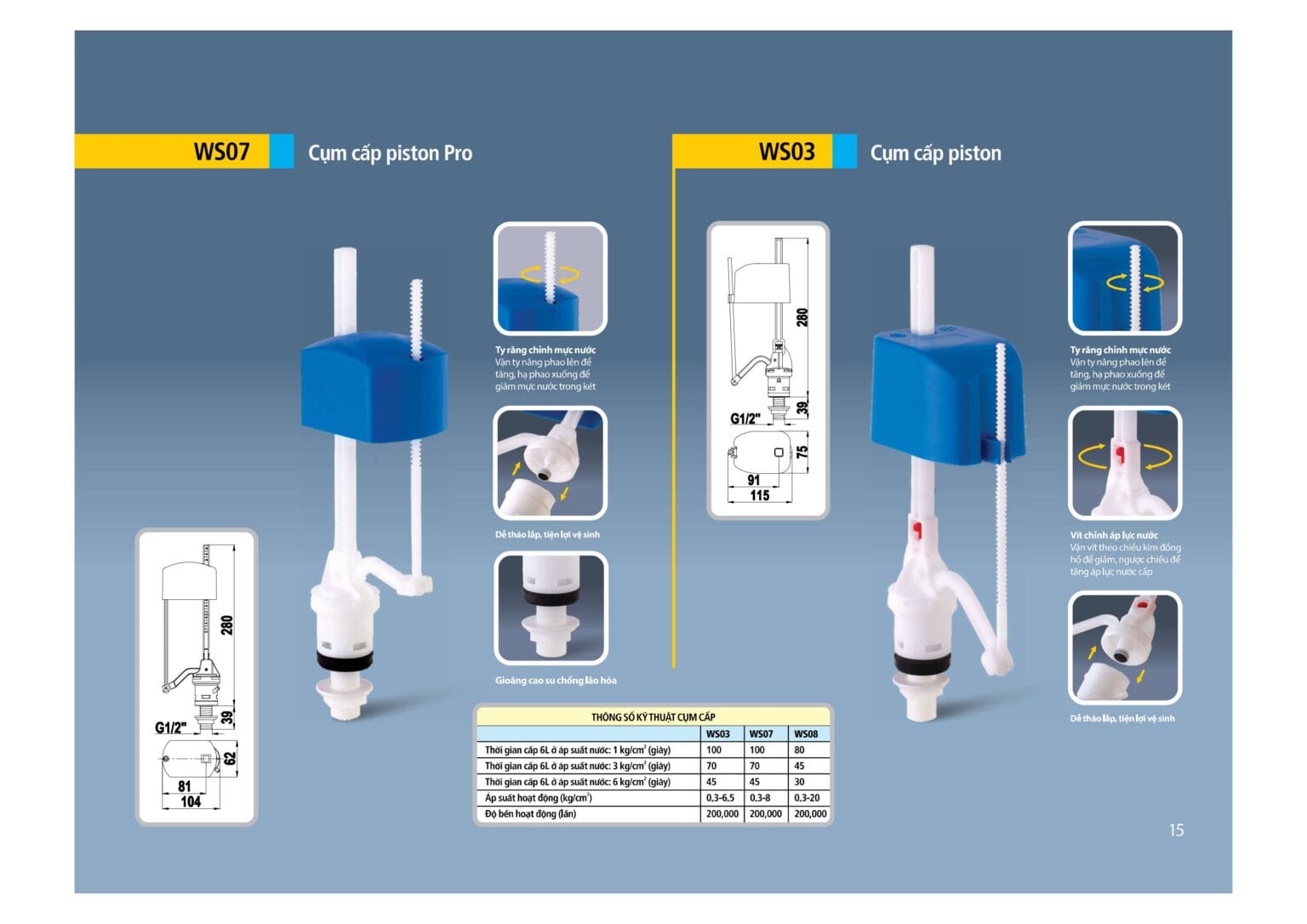 Cum cấp Piston WS03 dùng cho bộ xả thùng nước bồn cầu (cột cấp) dùng được cho tất cả các loại bồn cầu 1 khối và 2 khối hiện có trên thị trường như Kohler -ToTo-American Standard –CotTo- Inax – Casear -Basic S - Napolon- Keli-Karat-Imex- Viglacera – Thiên Thanh- Dolacera – Thanh Trì – Hảo Cảnh- Cosani- Minh Long –Caravi…