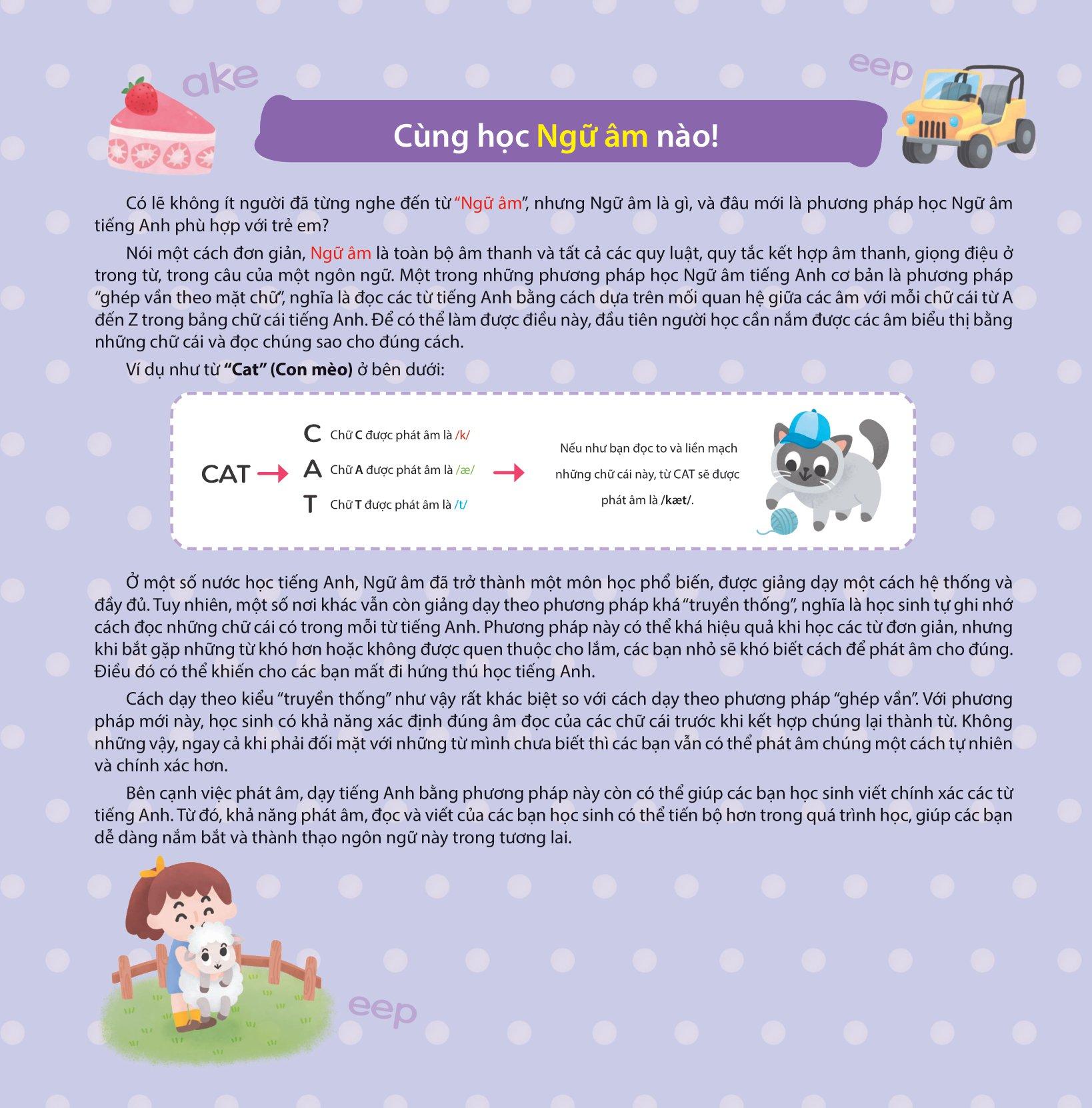 Với những ví dụ sinh động, dễ tiếp thu, kèm theo các bài thực hành nâng cao đầy tính thực tiễn và các audio dạy phát âm chuẩn bằng giọng Anh-Mỹ bản xứ, bộ sách sẽ cung cấp cho các em những kiến thức cần thiết để học ngữ âm tiếng Anh. Đúng như tên gọi, bộ sách được chia thành ba cấp độ từ cơ bản đến phức tạp, hướng dẫn các em rèn luyện từng bước một để nắm chắc các âm trong tiếng Anh. Ngoài ra, bộ sách còn lồng ghép những bài hát vui nhộn và những câu chuyện ngắn được minh họa đẹp mắt, hứa hẹn sẽ giúp cho việc học tập của các em thêm phần thú vị và hiệu quả.