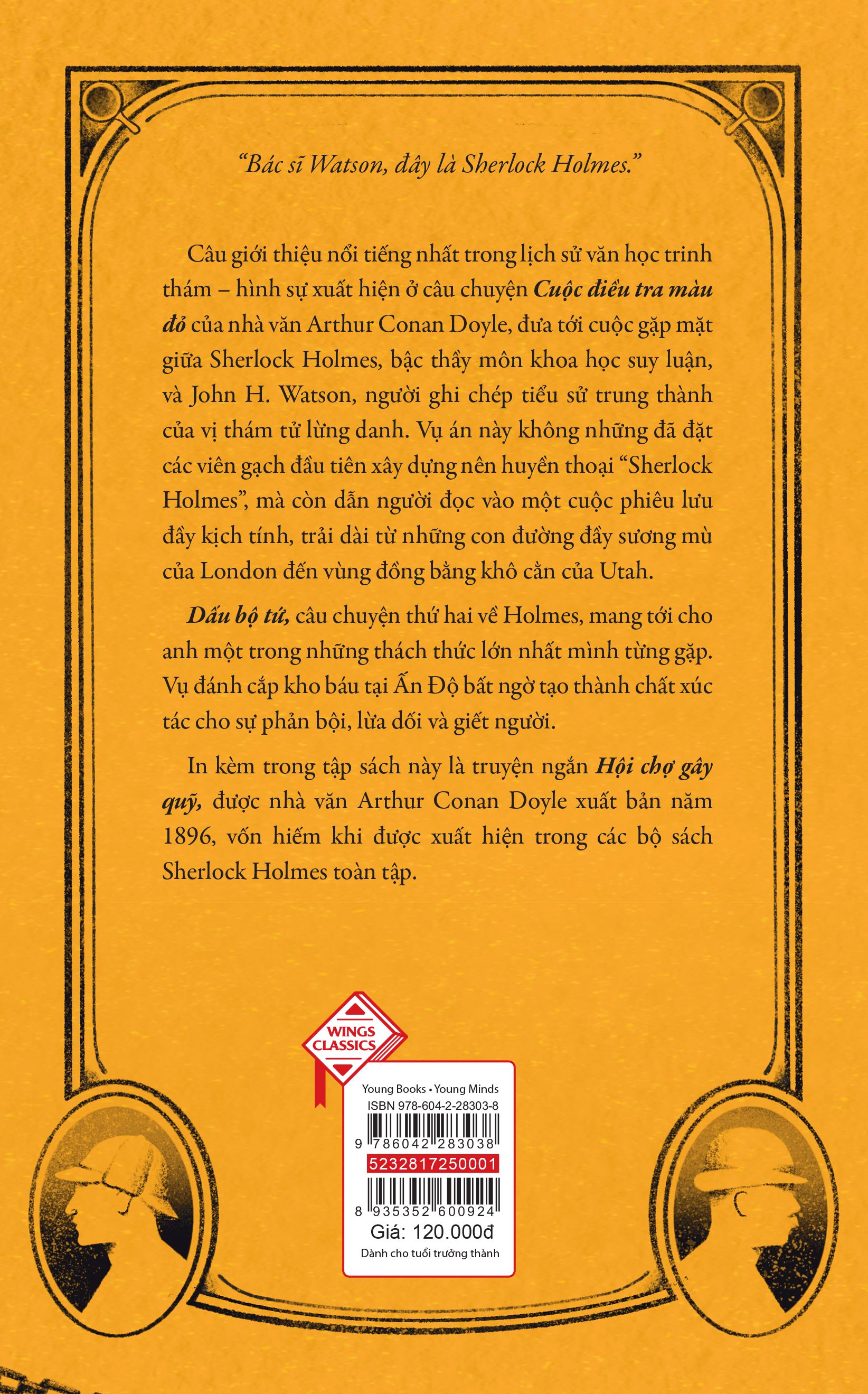 Mua tại TiktokSHERLOCK HOLMES TRỌN BỘ 6 TẬP VỚI BẢN DỊCH MỚI VÀ THIẾT KẾ GÁY GHÉP HÌNH ĐỘC ĐÁO!!! “Bác sĩ Watson, đây là Sherlock Holmes.” Câu giới thiệu nổi tiếng nhất trong lịch sử văn học trinh thám – hình sự xuất hiện ở câu chuyện Cuộc điều tra màu đỏ của nhà văn Arthur Conan Doyle, đưa tới cuộc gặp mặt giữa Sherlock Holmes, bậc thầy môn khoa học suy luận, và John H. Watson, người ghi chép tiểu sử trung thành của vị thám tử lừng danh. Vụ án này không những đã đặt các viên gạch đầu tiên xây dựng nên huyền thoại “Sherlock Holmes”, mà còn dẫn người đọc vào một cuộc phiêu lưu đầy kịch tính, trải dài từ những con đường đầy sương mù của London đến vùng đồng bằng khô cằn của Utah. Dấu bộ tứ, câu chuyện thứ hai về Holmes, mang tới cho anh một trong những thách thức lớn nhất mình từng gặp. Vụ đánh cắp kho báu tại Ấn Độ bất ngờ tạo thành chất xúc tác cho sự phản bội, lừa dối và giết người. In kèm trong tập sách này là truyện ngắn Hội chợ gây quỹ, được nhà văn Arthur Conan Doyle xuất bản năm 1896, vốn hiếm khi được xuất hiện trong các bộ sách Sherlock Holmes toàn tập.