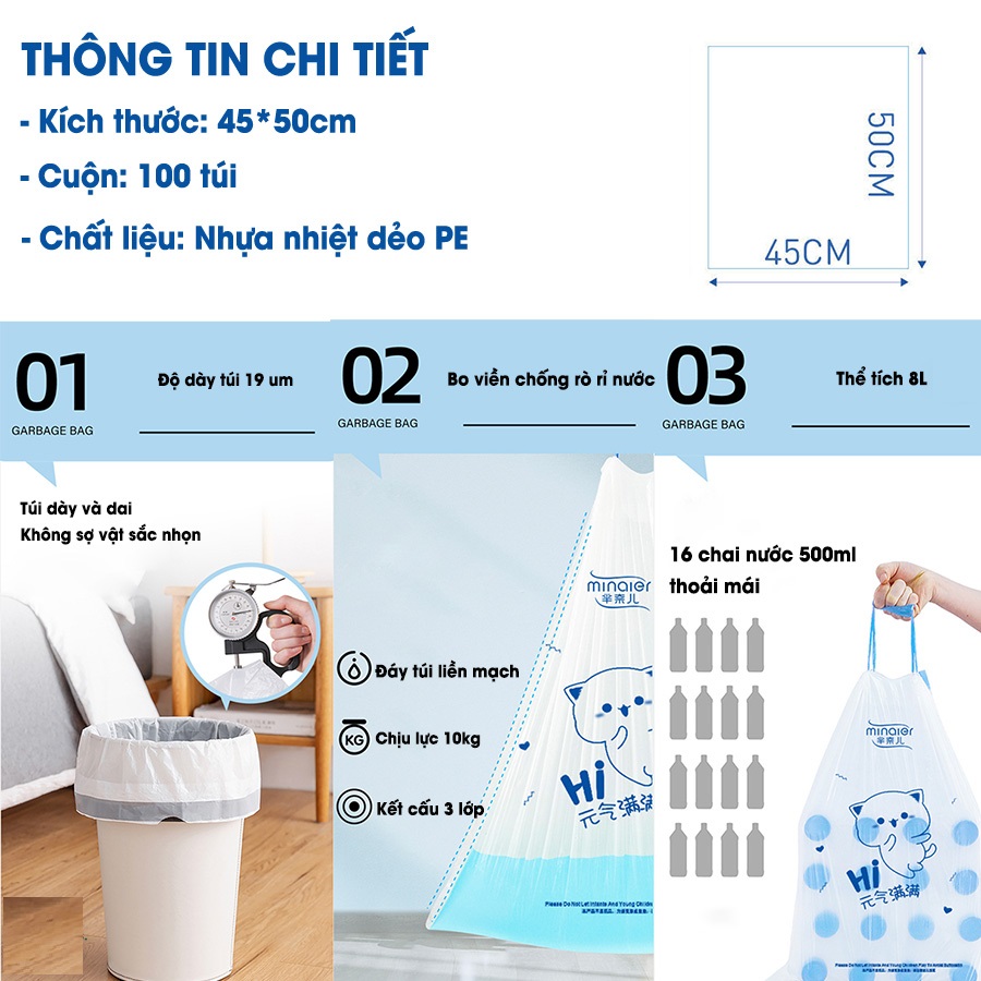 TÚI ĐỰNG RÁC DÂY RÚT CUỘN 100 TÚI Túi đựng rác dây rút Minaier chống rò rỉ nước, không sợ bẩn tay Freeship Túi đựng rác cuộn 100 túi siêu dai kích thước 45x50cm Túi