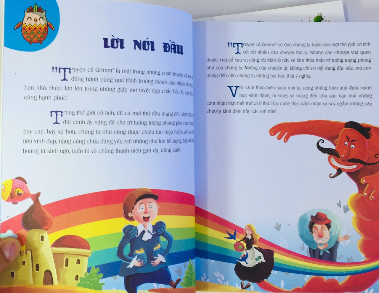 “Truyện cổ Grim” sẽ đưa các bạn nhỏ bước vào một thế giới cổ tích êm đềm và tươi đẹp. Ở thế giới ấy, chúng ta như được phiêu lưu cùng những chàng hoàng tử khôi ngô tuấn tú, những nàng công chúa xinh đẹp, đáng yê Rồi chẳng hay tự bao giờ chúng ta học hỏi sự lương thiện của nàng Bạch Tuyết, biết lấy việc giúp đỡ người khác làm niềm vui như bảy chú lùn, học cách tự bảo vệ mình qua truyện Chó sói và bảy chú dê