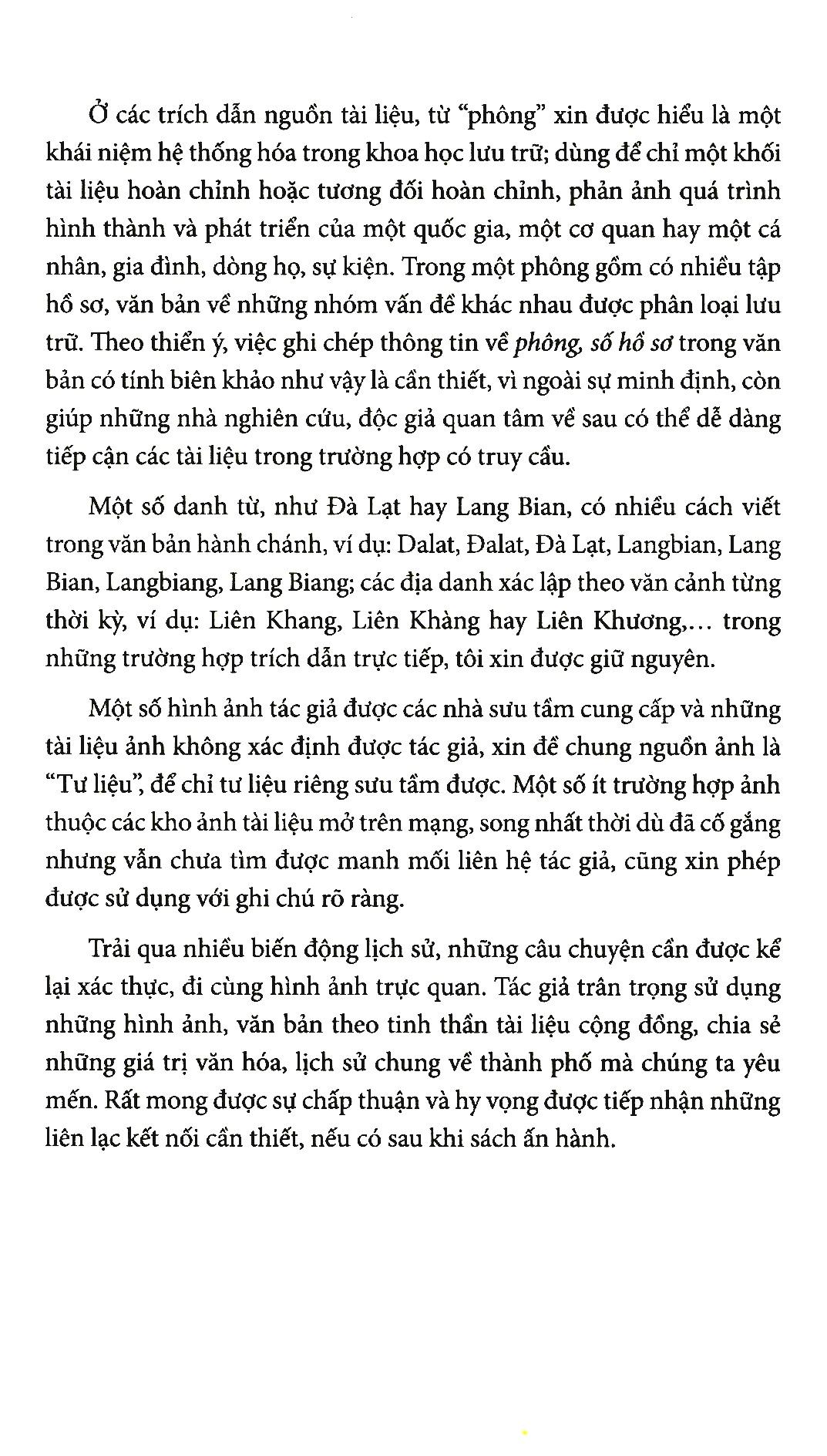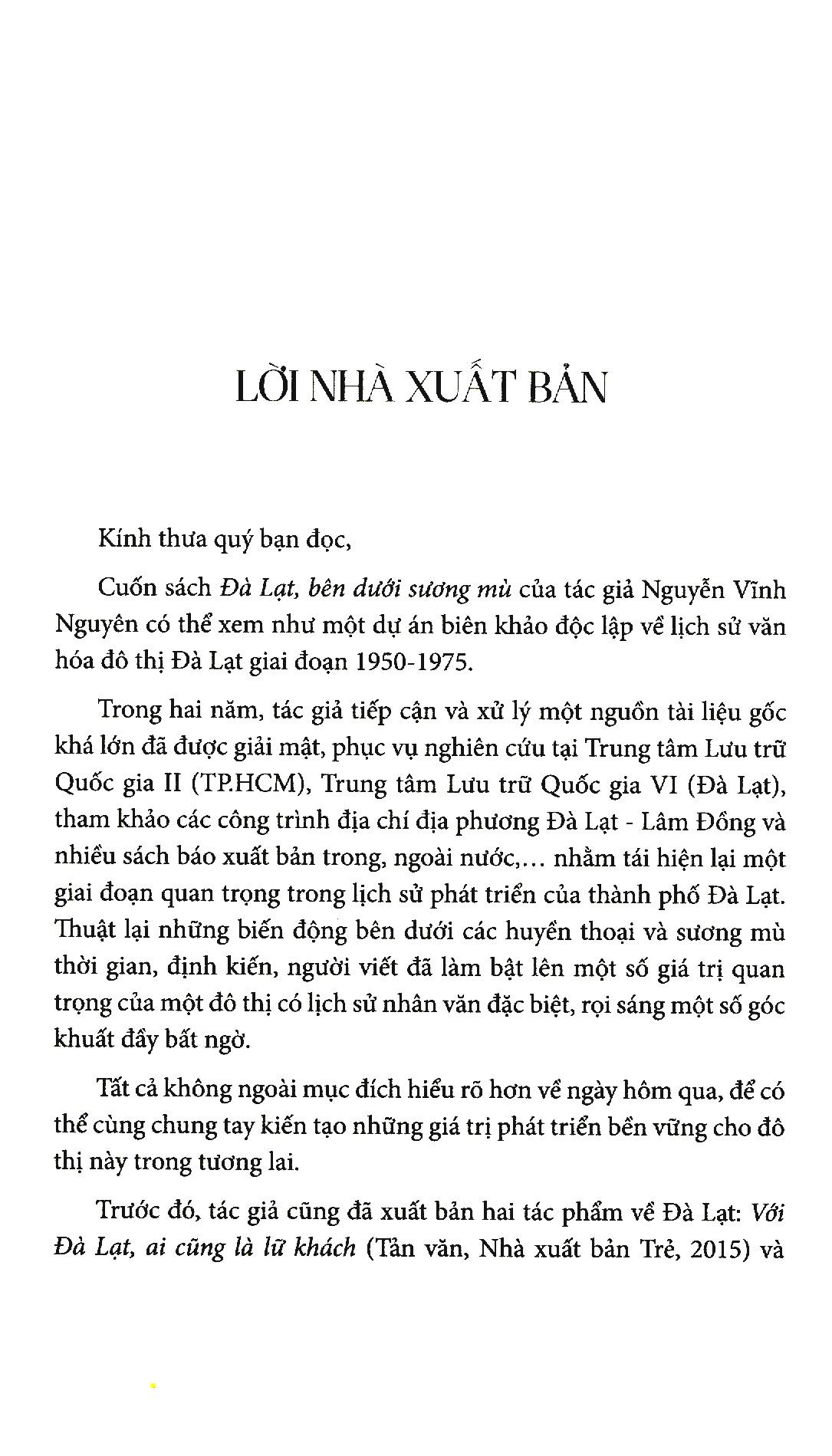 Hai năm trôi qua, người viết cuốn sách này đã lật dở hàng ngàn trang văn bản cùng hàng trăm tài liệu qua nhiều thời kỳ lịch sử Đà Lạt để chỉ làm một cuộc ghi nhận cô đọng, giúp người đọc hình dung về những gì chìm dưới sương mù.
