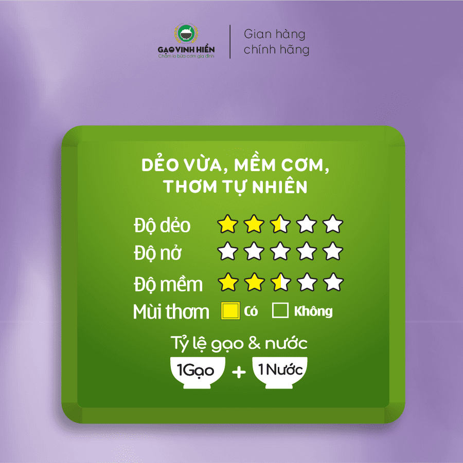 - Đặc điểm nổi bật: Cơm nấu lên có độ dẻo vừa, mềm cơm, mùi thơm tự nhiên, vẫn ngon sau khi để nguội. Sản phẩm đạt tiêu chuẩn an toàn vệ sinh thực phẩm với cam kết 3 không: