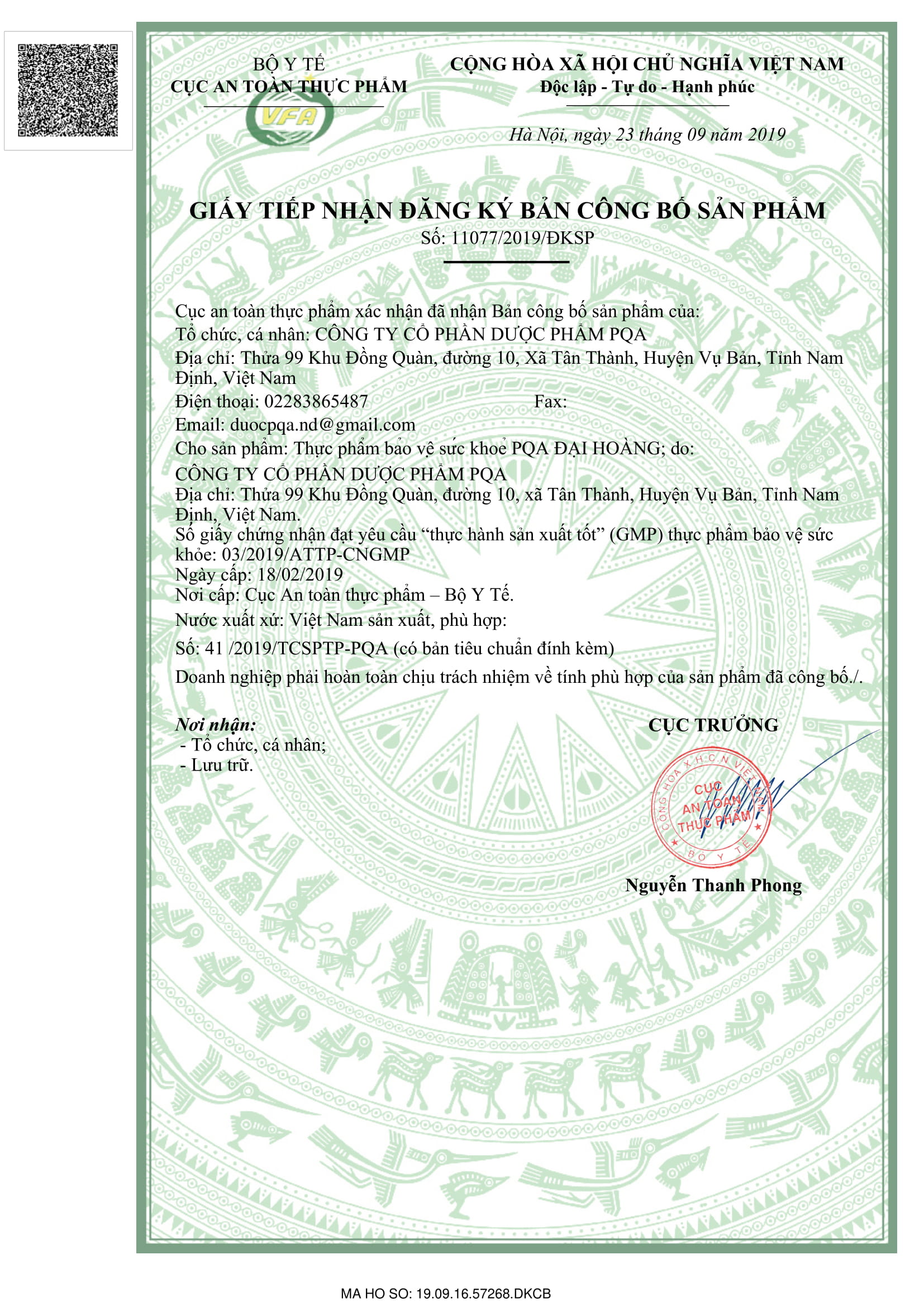 - Địa chỉ sản xuất: Công ty Cổ phần Dược phẩm PQA. Thửa 99, Khu Đồng Quàn, Xã Tân Thành, Huyện Vụ Bản, Tỉnh Nam Định. THÀNH PHẦN: