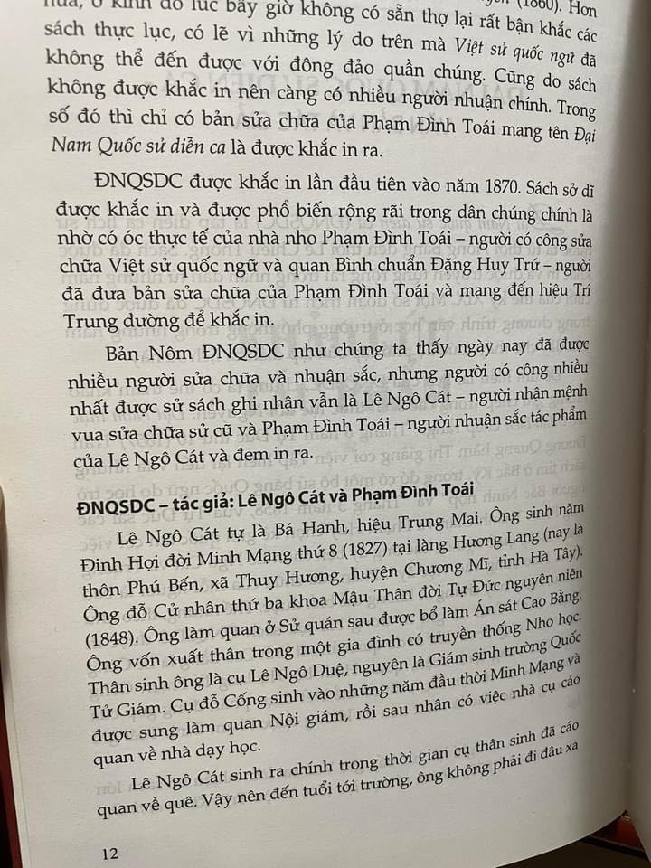 Là một tác phẩm viết bằng chữ Nôm rất nổi tiếng về văn chương và sử liệu, Đại Nam quốc sử diễn ca là tập sử ký quốc gia tiêu biểu, miêu tả nhiều sự kiện lịch sử nước ta từ thời Hồng Bàng đến thời Lê Chiêu Thống (1787 - 1788). Đại Nam quốc sử diễn ca do Lê Ngô Cát (1827 - ?) biên soạn, Phạm Đình Toái (? - ?) nhuận sắc và được đưa khắc in vào năm 1870 dưới triều vua Tự Đức thời Nguyễn. Ngay từ cuối thế kỷ XIX (năm 1875) Đại Nam quốc sử diễn ca đã được phiên âm ra Quốc ngữ và cho đến nay đã có 14 bản phiên âm được lưu hành cùng độc giả.