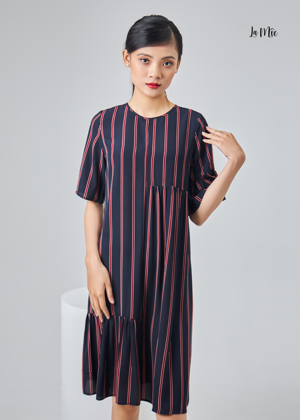 Đầm lụa La Mộc cổ tròn, chất liệu lụa Korea, hoạ tiết sọc dọc tím trắng đỏ, cúp cách điệu nhún nhẹ phần chân váy và phần hông.