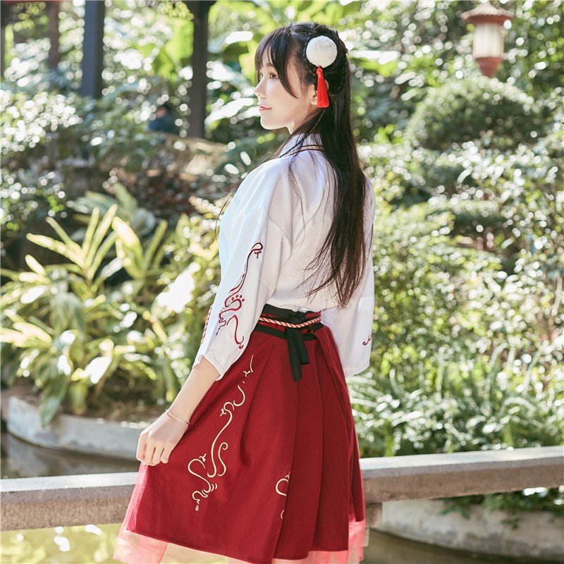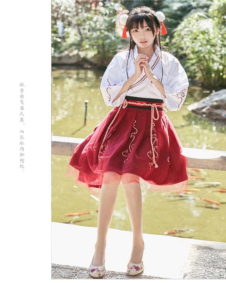 Kiểu dáng: trang phục Hán Phục cách tân Màu sắc: Áo màu trắng, Đầm màu đỏ Kích thước: Freesize (Vòng ngực 92cm, Áo dài 49cm, Tay dài 48cm, Váy dài 58cm) Bộ sản phẩm: gồm