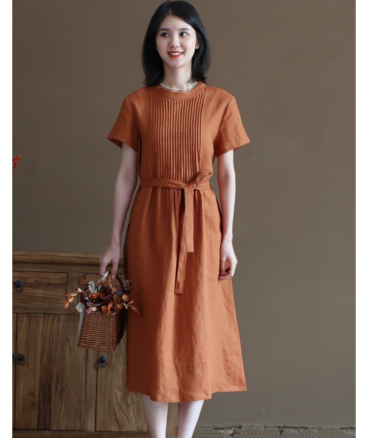 ✨Đầm suông linen nữ cổ tròn kín đáo, đầm có túi chéo tiện lợi, kèm dây thắt eo xinh NH191 cam