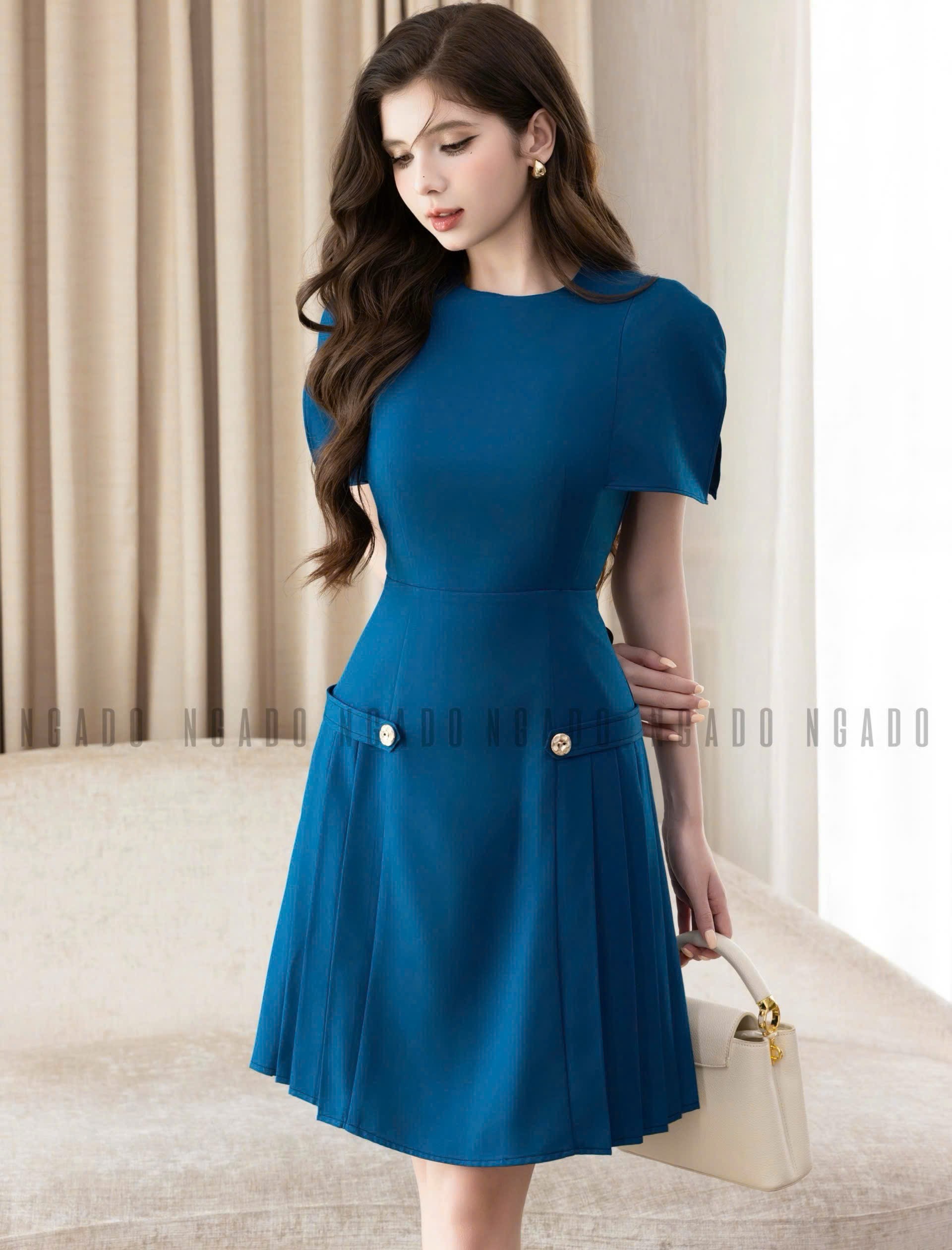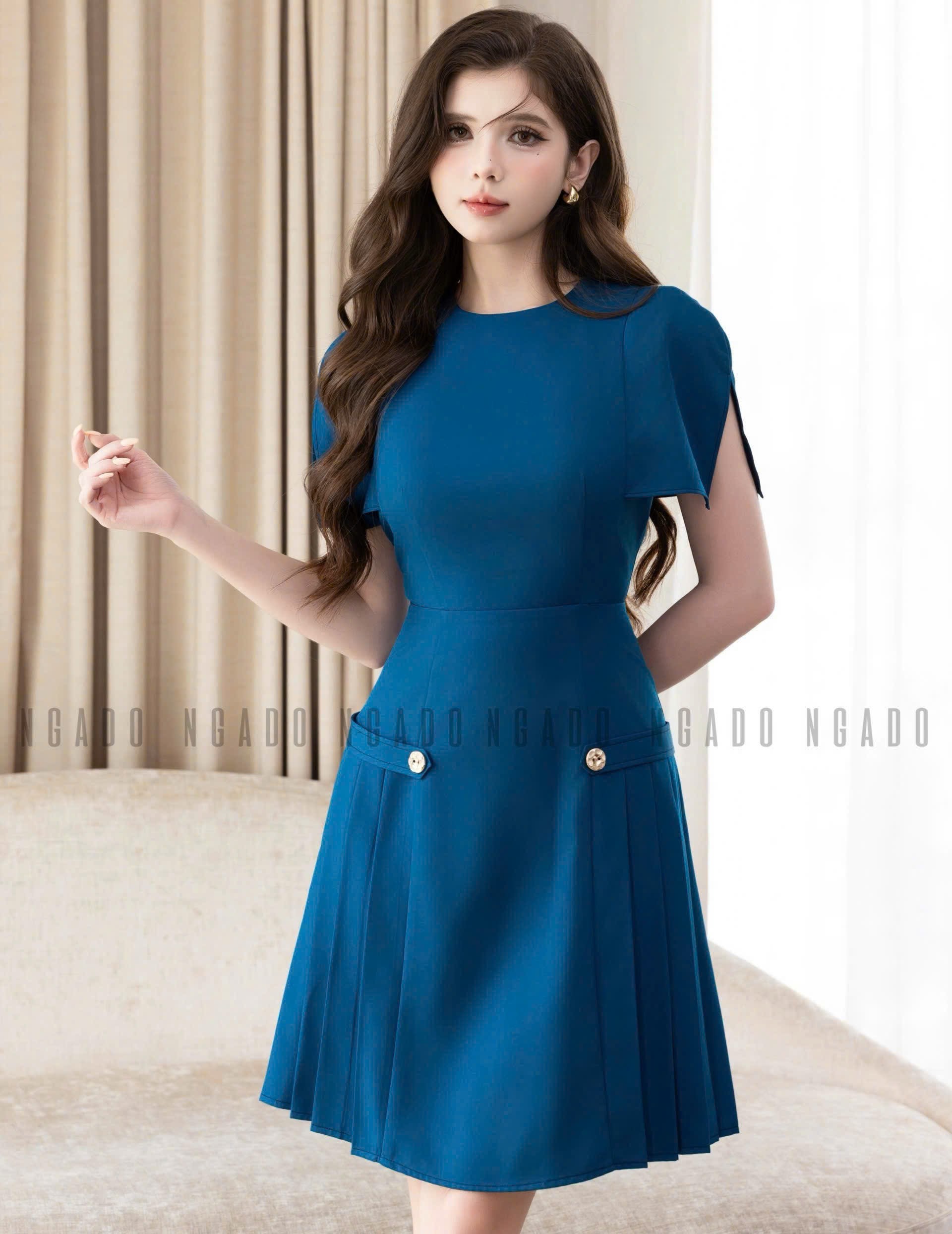 ✨Đầm xanh cổ tròn xếp ly NGADO , đầm nữ , đầm kiểu , đầm công sở , dự tiệc