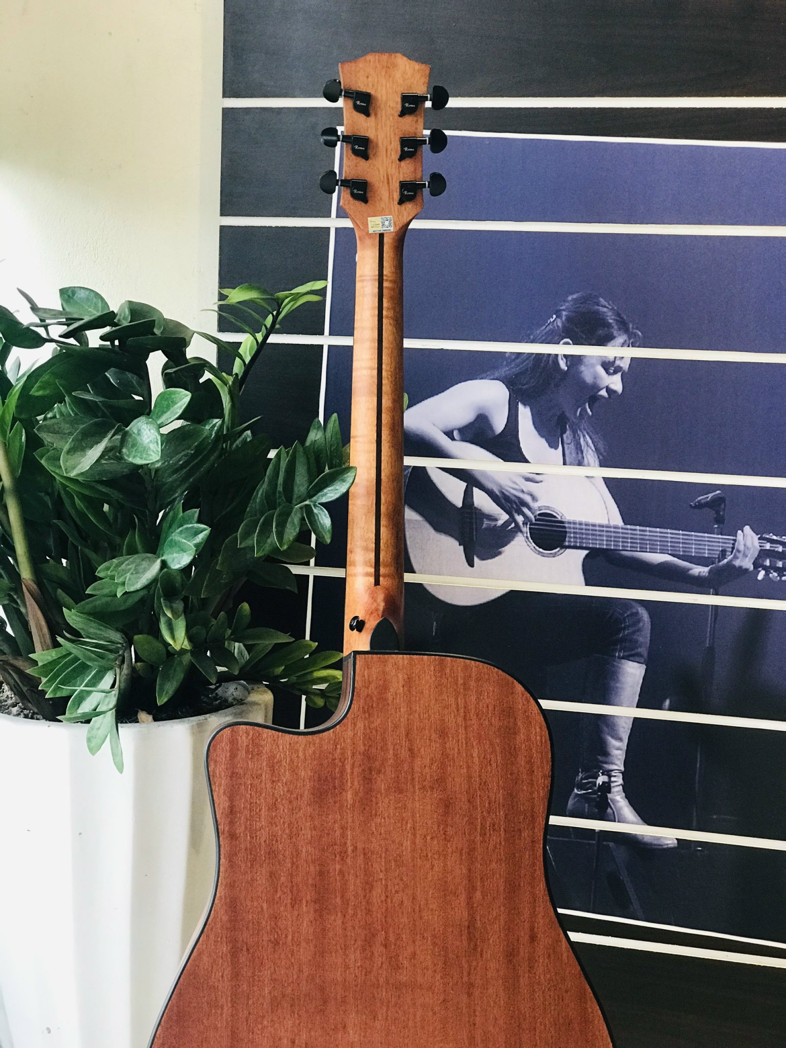 Mặt: Gỗ Thông Sitka Eo + lưng: Gỗ Hồng Đào cao cấp. Cần: Gỗ Giá Tỵ, bọc chỉ tút, có ty chống cong cần. Mặt phím: Gỗ Đen Ngựa: Gỗ Mun Dây: Alice AW432 Khóa