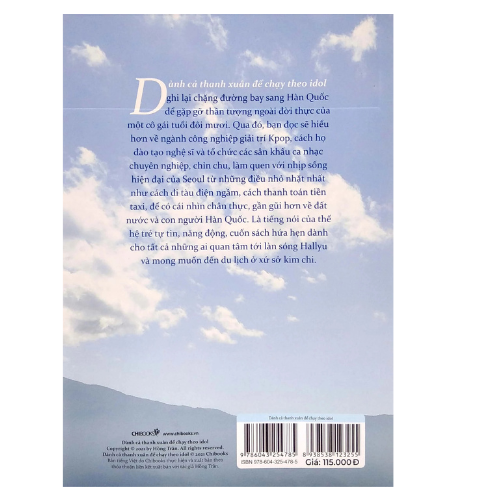 “Dành cả thanh xuân để chạy theo idol” ghi lại chặng đường bay sang Hàn Quốc để gặp gỡ thần tượng ngoài đời thực của một cô gái tuổi đôi mươi. Qua đó, bạn đọc sẽ hiểu hơn về ngành công nghiệp giải trí Kpop, cách họ đào tạo nghệ sĩ và tổ chức các sân khấu ca nhạc chuyên nghiệp, chỉn chu, làm quen với nhịp sống hiện đại của Seoul từ những điều nhỏ nhặt nhất như cách đi tàu điện ngầm, cách thanh toán tiền taxi, để có cái nhìn chân thực, gần gũi hơn về đất nước và con người Hàn Quốc. Là tiếng nói của thế hệ trẻ tự tin, năng động, cuốn sách hứa hẹn dành cho tất cả những ai quan tâm tới làn sóng Hallyu và mong muốn đến du lịch ở xứ sở kim chi.