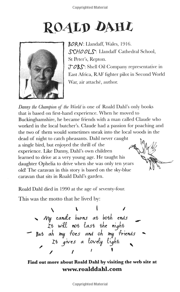 "A true genius . . . Roald Dahl is my hero" - David Walliams Phizzwhizzing new cover look and branding for the World's NUMBER ONE Storyteller! Danny lives in a gipsy caravan with his father, the most marvellous and exciting father any boy ever had. All the land around them belongs to Mr Victor Hazell, a rich snob with a great glistening beery face and tiny piggy eyes. Nobody likes him, not one-little bit. So one day, Danny and his father concoct a daring plot that will give the old blue-faced baboon Victor Hazell the greatest shock of his life - so long as they don't get caught Now you can listen to DANNY THE CHAMPION OF THE WORLD and other Roald Dahl audiobooks read by some very famous voices, including Kate Winslet, David Walliams and Steven Fry - plus there are added squelchy soundeffects from Pinewood Studios! And look out for new Roald Dahl apps in the App store and Google Play- including the disgusting TWIT OR MISS! and HOUSE OF TWITS inspired by the revolting Twits .