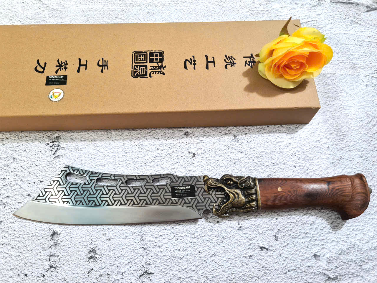 - DAO TR12 : Chiều dài TỔNG: 45cm Chiều dài lưỡi: 24.5cm Chiều rộng lưỡi: 7.5cm, Độ dày lưỡi: 6mm Trọng lượng: 1kg chất liệu lưỡi : 7Cr17MOV (thép 7 crom 17 molypden vanadi) Chất liệu tay cầm: gỗ cẩm lai, phụ kiện khâu đầu hổ và chuôi bằng đồng