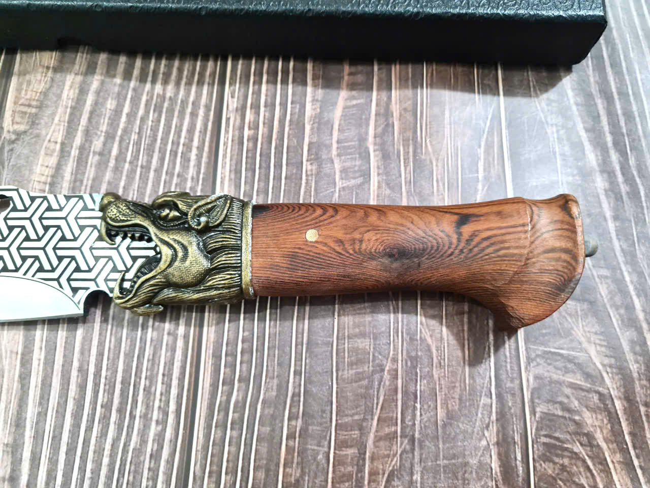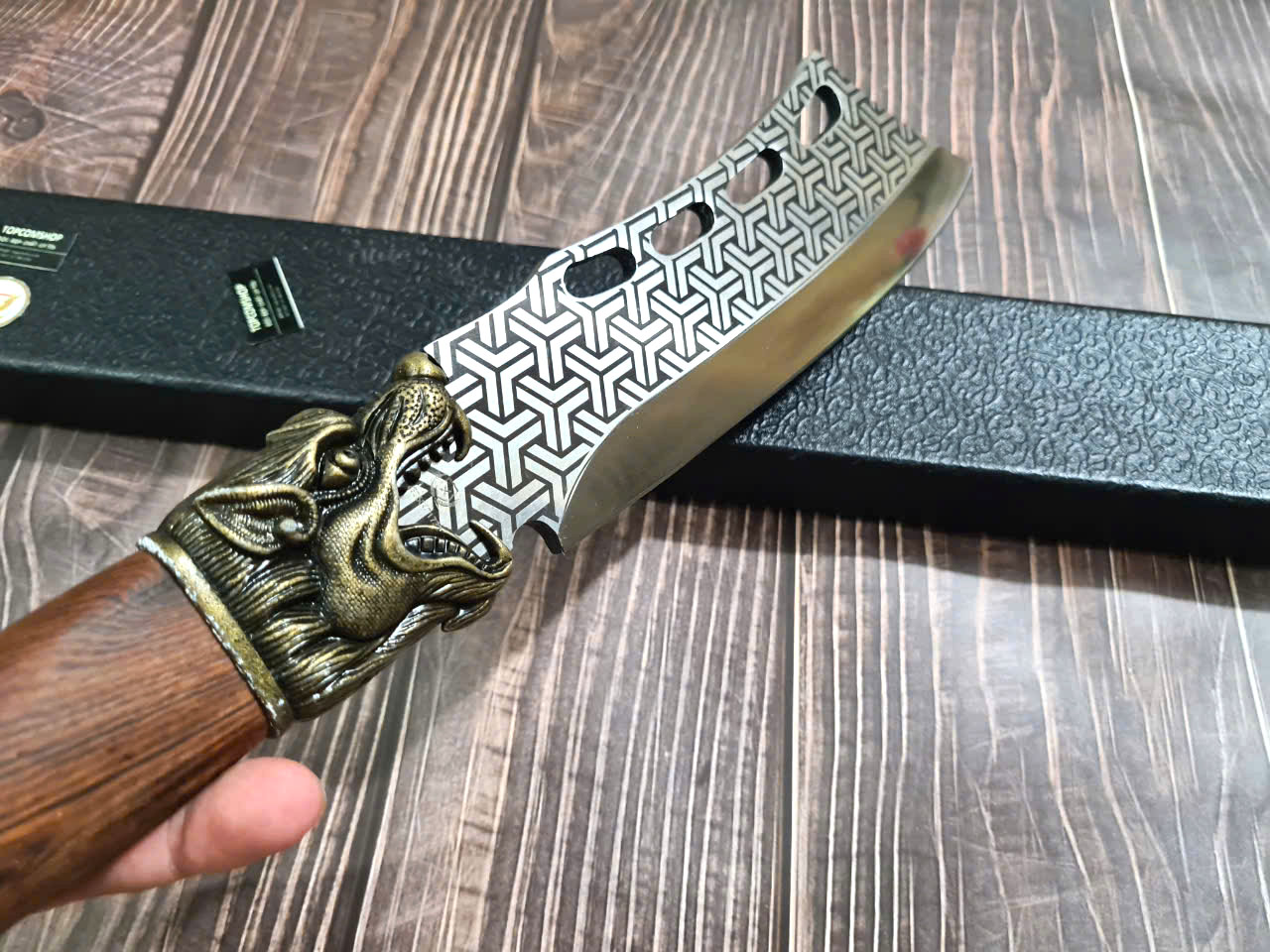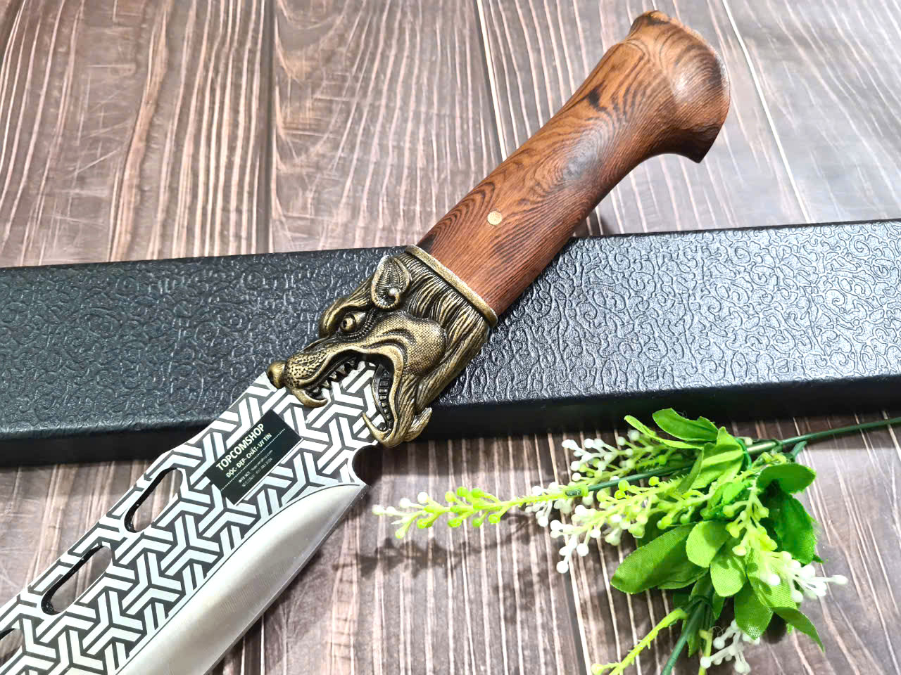 - DAO TR12 : Chiều dài TỔNG: 45cm Chiều dài lưỡi: 24.5cm Chiều rộng lưỡi: 7.5cm, Độ dày lưỡi: 6mm Trọng lượng: 1kg chất liệu lưỡi : 7Cr17MOV (thép 7 crom 17 molypden vanadi) Chất liệu tay cầm: gỗ cẩm lai, phụ kiện khâu đầu hổ và chuôi bằng đồng