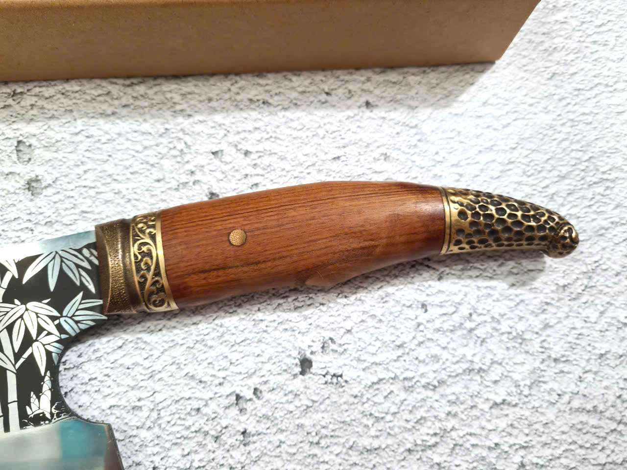 Chất liệu tay cầm: gỗ CẨM LAI, khâu và chuôi cuối dao bằng đồng thau