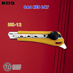- Hãng: KDS ( Nhật) Giới thiệu: Dao kéo dây HK-12 của hãng KDS (Nhật) có nhiều điểm mới hơn so với dao HK-11. Khóa dao dạng xoay tròn. Tay cầm được làm bằng nhựa cứng ABS. Bên trong được làm bằng inox chống gỉ. Dao dùng để cắt thảm, cắt mica, cắt dây nilon,... điểm đặc biệt của loại HK-12 là có thêm dụng cụ khui hộp. Lưỡi dao có 4 đốt. được tặng kèm lưỡi khi mua dao