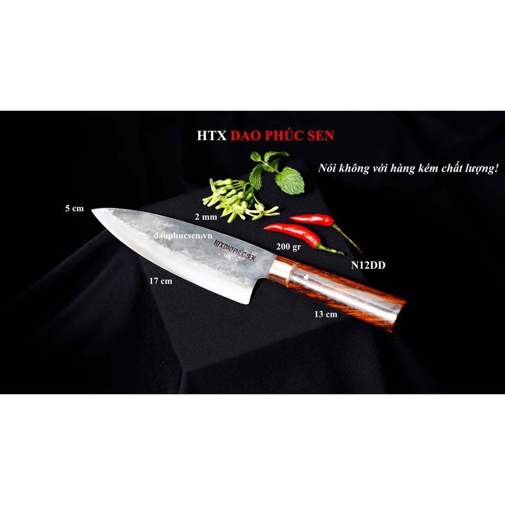 Dao Phúc Sen Bản Deba Khâu Đồng N12D - Kích thước: lưỡi: 17cm, cán: 12cm, rộng: 5,2cm, dầy: 0,2ly, trọng lượng: 200g - Chức năng: sử dụng chuyên thái lọc thịt ,cá, rau củ và