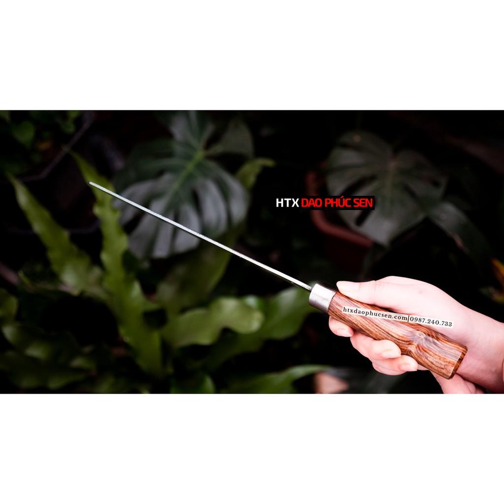 - Chức năng: chuyên chặt thái cá, chặt gà, lọ - Kích thước: Lưỡi: 26cm, cán: 12,5cm, rộng: 6,5cm, dầy: 4ly, trọng lượng: 480g - Cán : Gỗ mun , Khâu và chốt đồng đỏ