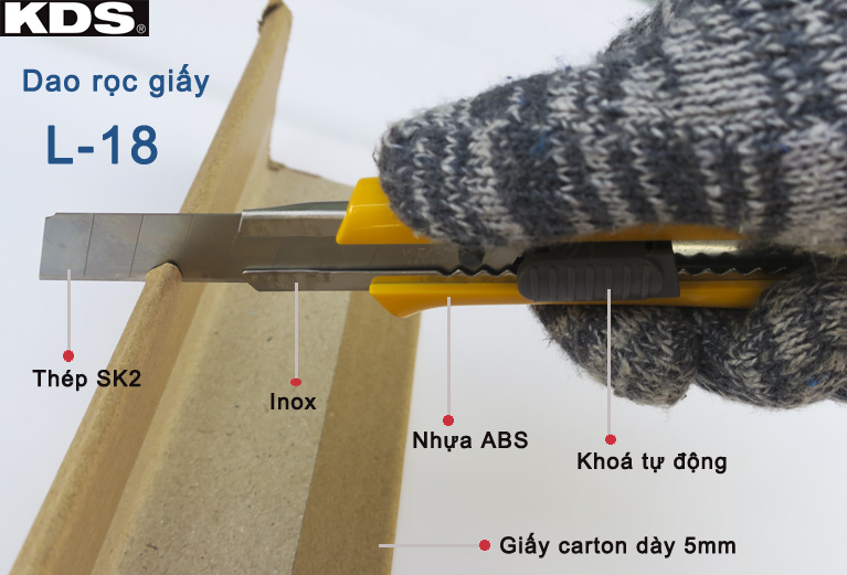 DAO RỌC GIẤY KHÓA TỰ ĐỘNG KDS L-18 THÔNG SỐ KỸ THUẬT DAO RỌC GIẤY L-18: - Chất liệu: Inox, nhựa ABS - Kích thước: 16cm x 4cm x 2.5cm - Kích thước đóng