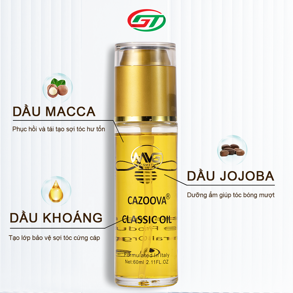 *** Tinh dầu dưỡng tóc Cazoova Classic oil là sản phẩm giúp cải thiện tình trạng tóc hư tổn, khô xơ, gãy rụng do tóc tiếp xúc với hoá chất hoặc do tác động từ môi trường. Tinh dầu dưỡng tóc Cazoova Classic oil được chiết xuất từ 3 loại tinh dầu giúp bạn tự tin lấy lại mái tóc suôn mượt, bồng bềnh. Tinh dầu macca giàu dưỡng chất giúp phục hồi và tái tạo tóc hư tổn nuôi dưỡng tóc từ gốc đến ngọn, tinh dầu jojoba liên tục bổ sung dưỡng chất thiết yếu cần thiết giúp tóc phát triển và luôn bóng mượt, thơm mát. Dầu khoáng hỗ trợ trong quá trình cung cấp độ ẩm cho tóc và tạo lớp bảo vệ giúp tóc bóng mượt.
