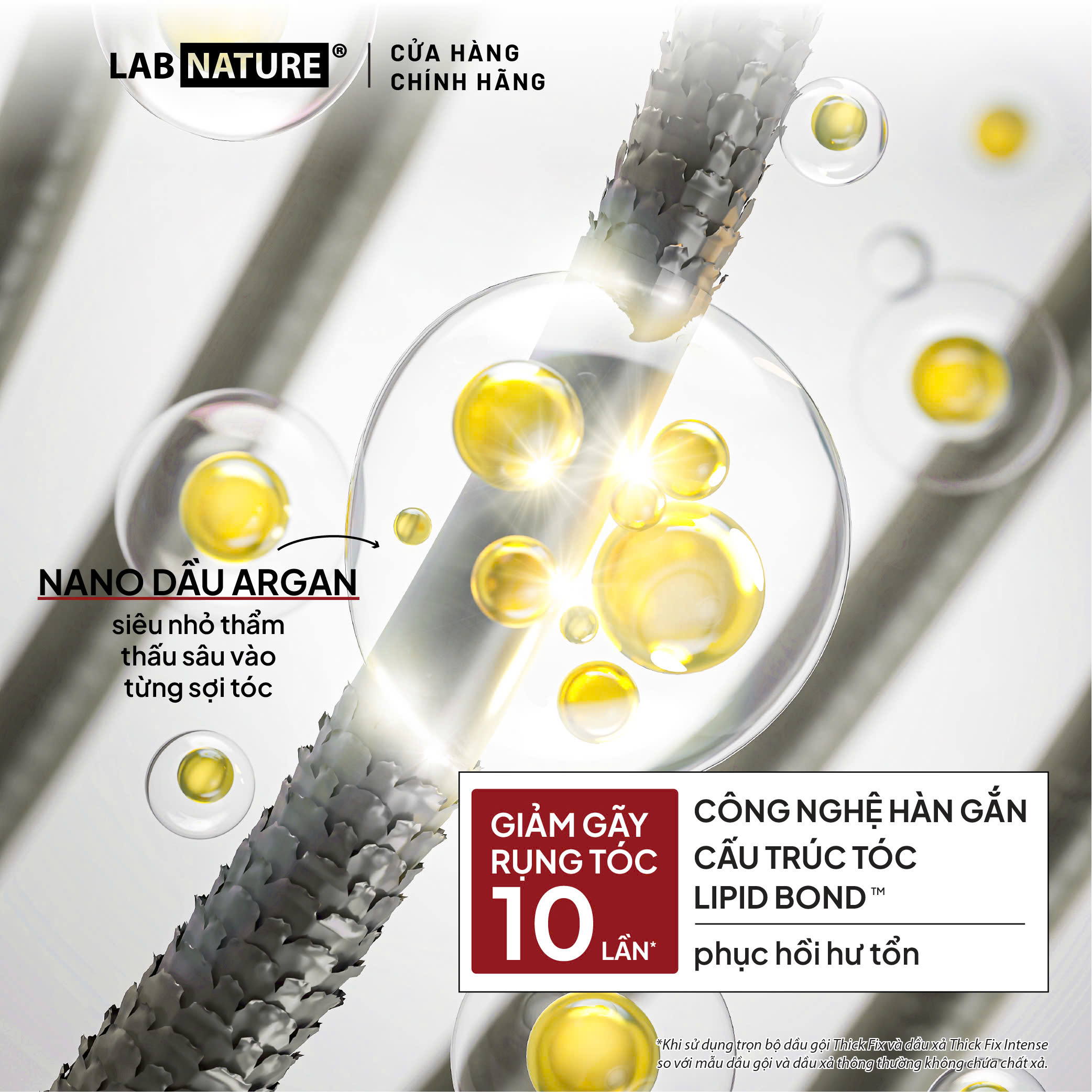 Dầu gội Thick Fix với công nghệ Hàn Gắn Cấu Trúc Lipid LayerTM từ phát minh độc quyền tại Mỹ, chứa các hạt Nano Dầu Argan thiên nhiên, giúp làm sạch nhẹ nhàng và thẩm