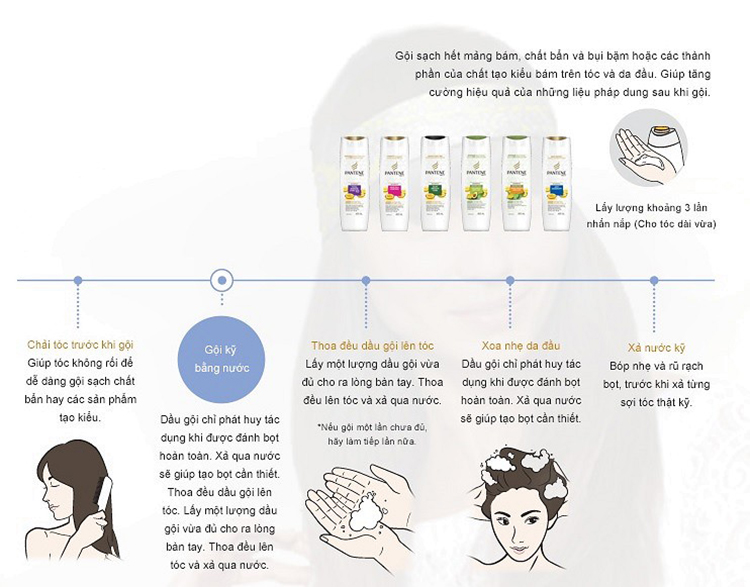 - Cung cấp độ ẩm, hạn chế sự xơ rối khi chải. Loại tóc: Tóc yếu, trong tình trạng bị gãy, rụng nhiều. Hướng dẫn sử dụng Bước 1: Làm ướt tóc với nước ấm/lạnh (không dùng nước nóng). Bước 2: Cho một lượng vừa đủ dầu gội ra lòng bàn tay. Xoa bóp nhẹ nhàng để tạo bọt. Bước 3: Xả sạch lại với nước. Bước 4: Sau khi gội sạch tóc bằng dầu gội Pantene Ngăn Rụng Tóc cho một lượng vừa đủ kem xả ra lòng bàn tay. Nhẹ nhàng vuốt kem dọc theo chiều dài tóc. Lưu ý bôi kem xả cách chân tóc 5cm và không bôi vào da đầu. Bước 5: Xả sạch lại với nước ấm/ lạnh (không dùng nước nóng). Khuyến cáo: Tránh nhiệt độ cao và ánh sáng trực tiếp.