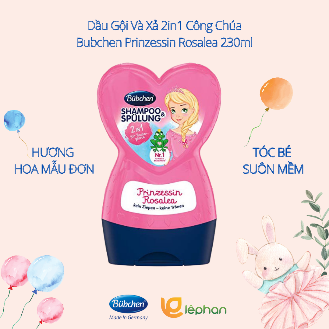 - Dầu gội xả Bubchen Shampoo & Spulung Prinzessin Rosalea 2in1 Hương Hoa cho bé gái, giúp làm sạch và chăm sóc tóc mềm mại. Với các thành phần tự nhiên, cung cấp độ ẩm chuyên sâu và đặc biệt dịu nhẹ với da của trẻ. Không gây cay mắt. Bao bì hình trái tim độc đáo và hương thơm mê hoặc, đảm bảo cho bé niềm vui khi gội đầu và mái tóc mềm mượt. Thành phần