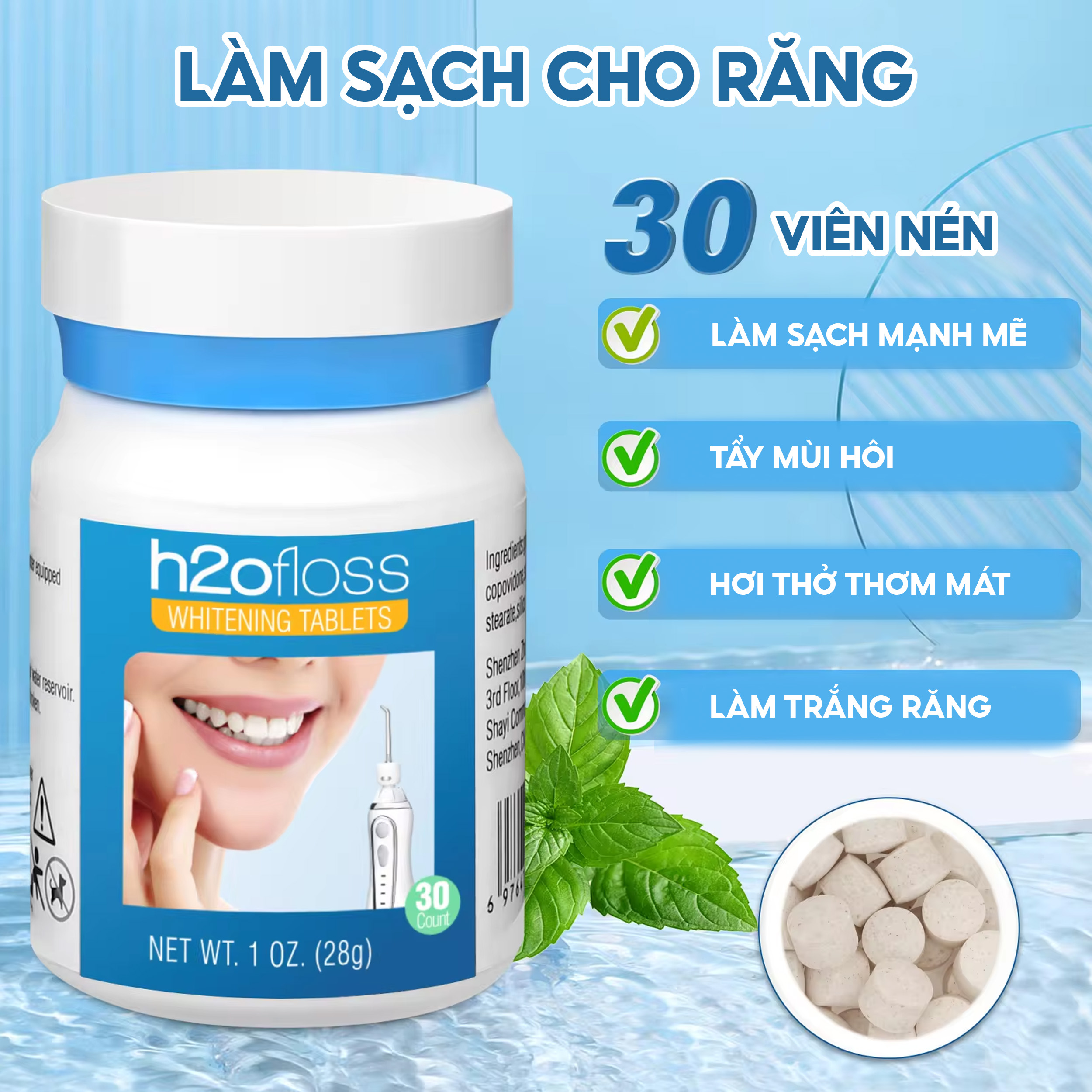 ✨Đầu tăm nước cho máy h2ofloss với 30 viên trắng răng cho hơi thở thơm mát và răng trắng sáng tự nhiên